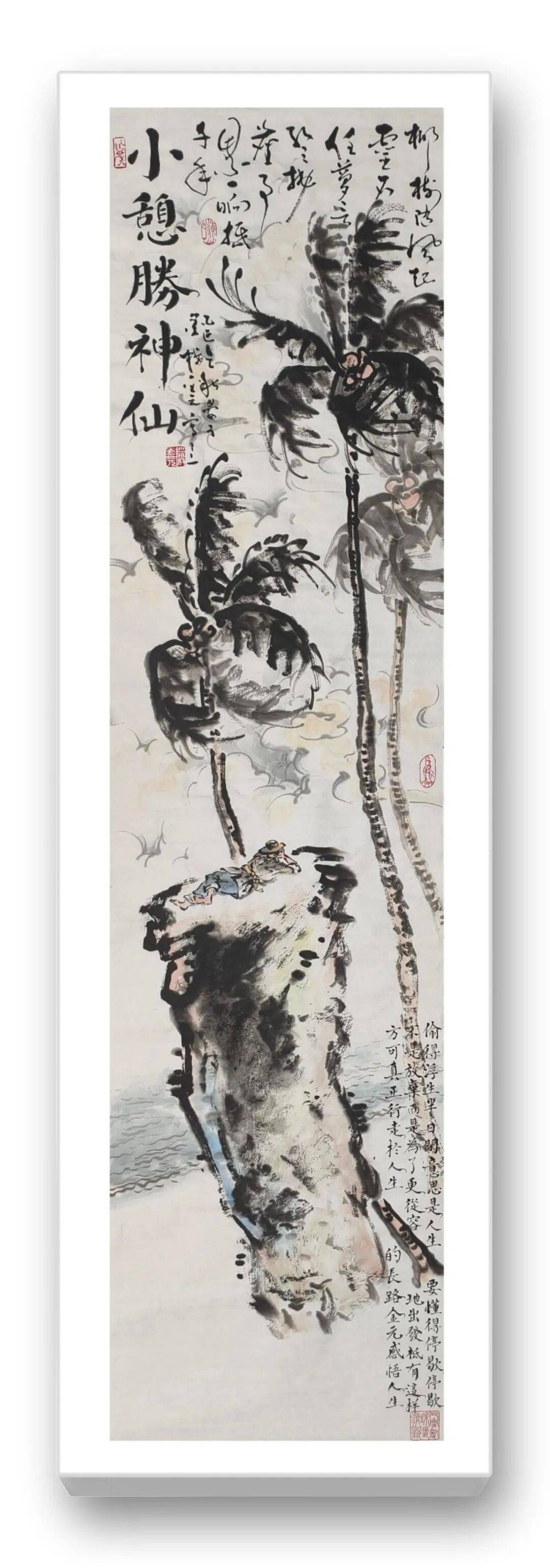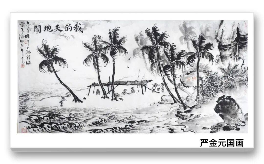 严金元的艺术根基深植于书法的长期浸淫。他将篆隶的古朴、行草的奔放融入国画线条,使笔下的山川、人物、生灵都自带一种书法的筋骨与韵律。在小憩胜神仙中,椰树的挺拔枝干以如锥画沙的篆隶笔法写出,线条凝练遒劲,兼具“骨法用笔”的严谨与“气韵生动”的豪放;在出海里,渔民的衣褶与船身轮廓以行草的使转笔法勾勒,墨色浓淡间尽显灵动洒脱。