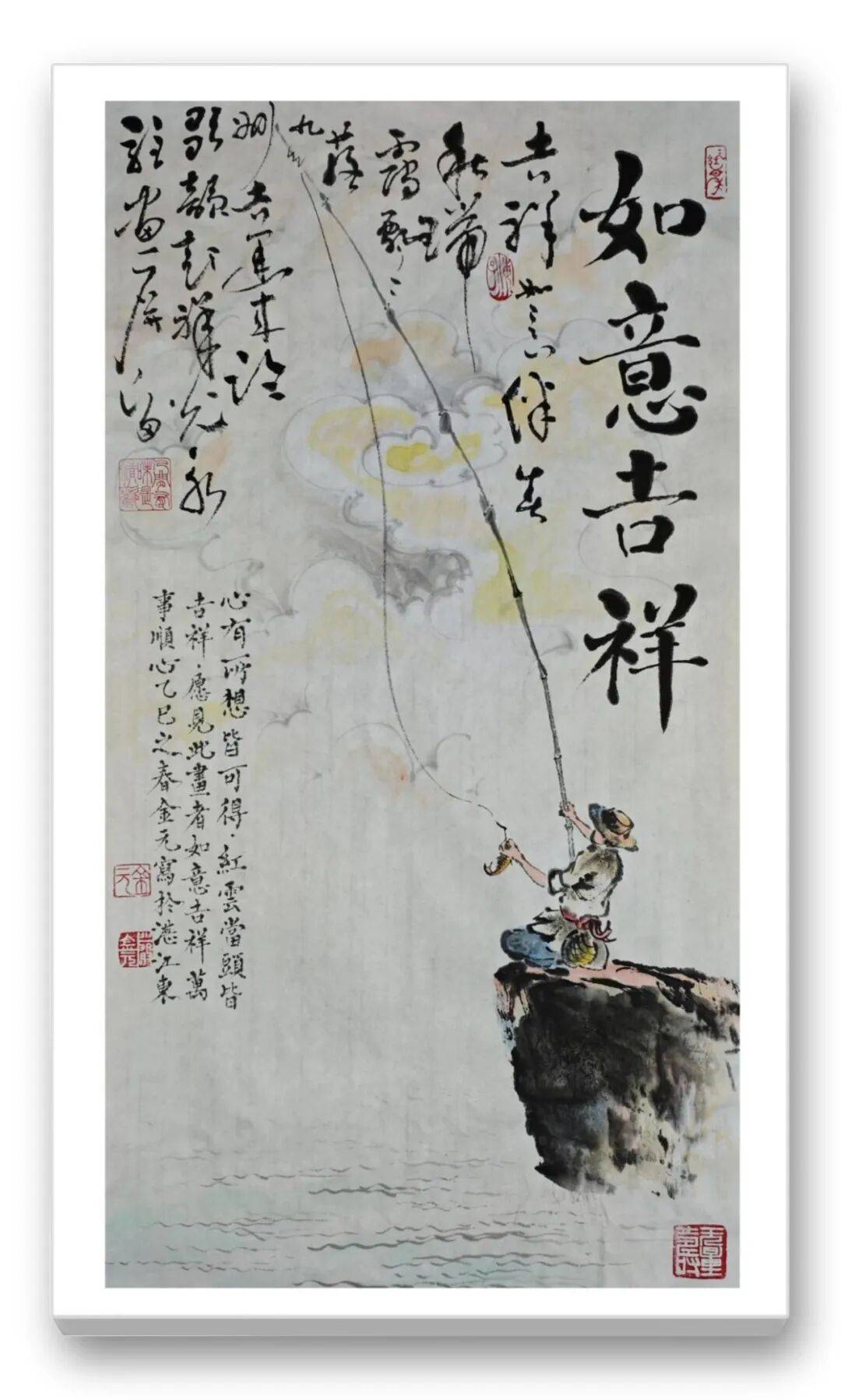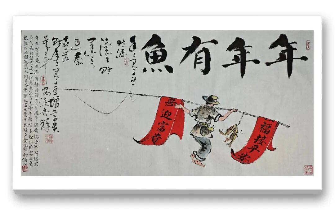 更为动人的是,严金元的作品始终保持着对生活的温情与敬意。在年年有鱼中,渔父扛着“喜迎富贵”“福接平安”的红幡,游鱼在竿头灵动摆动,画面以喜庆的色彩与诙谐的造型,传递出对平凡生活的热爱与对美好未来的期许。这种接地气的表达,让他的作品既有文人画的雅致,又有民间艺术的鲜活,在雅俗共赏中,拉近了传统艺术与当代观众的距离。