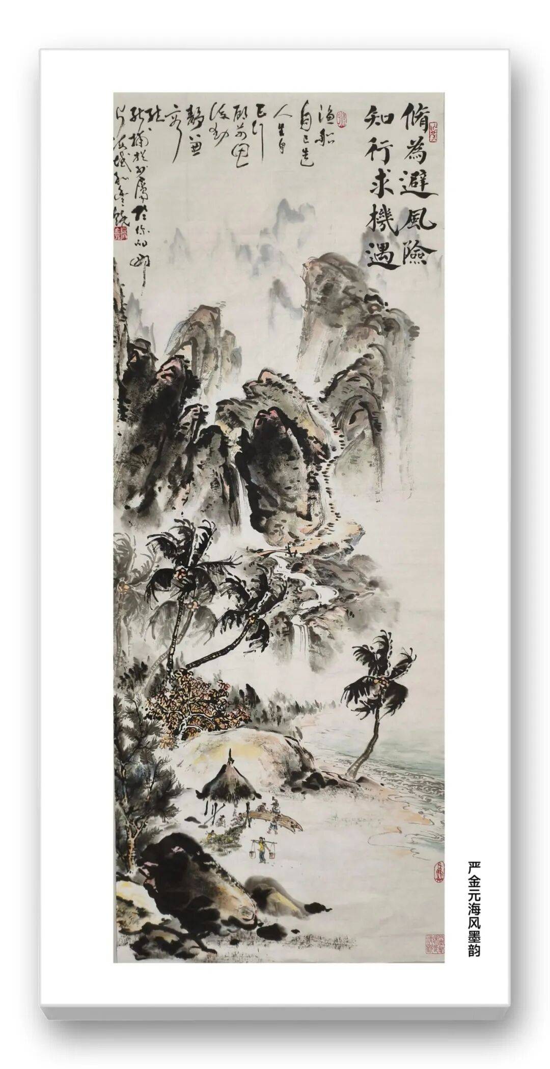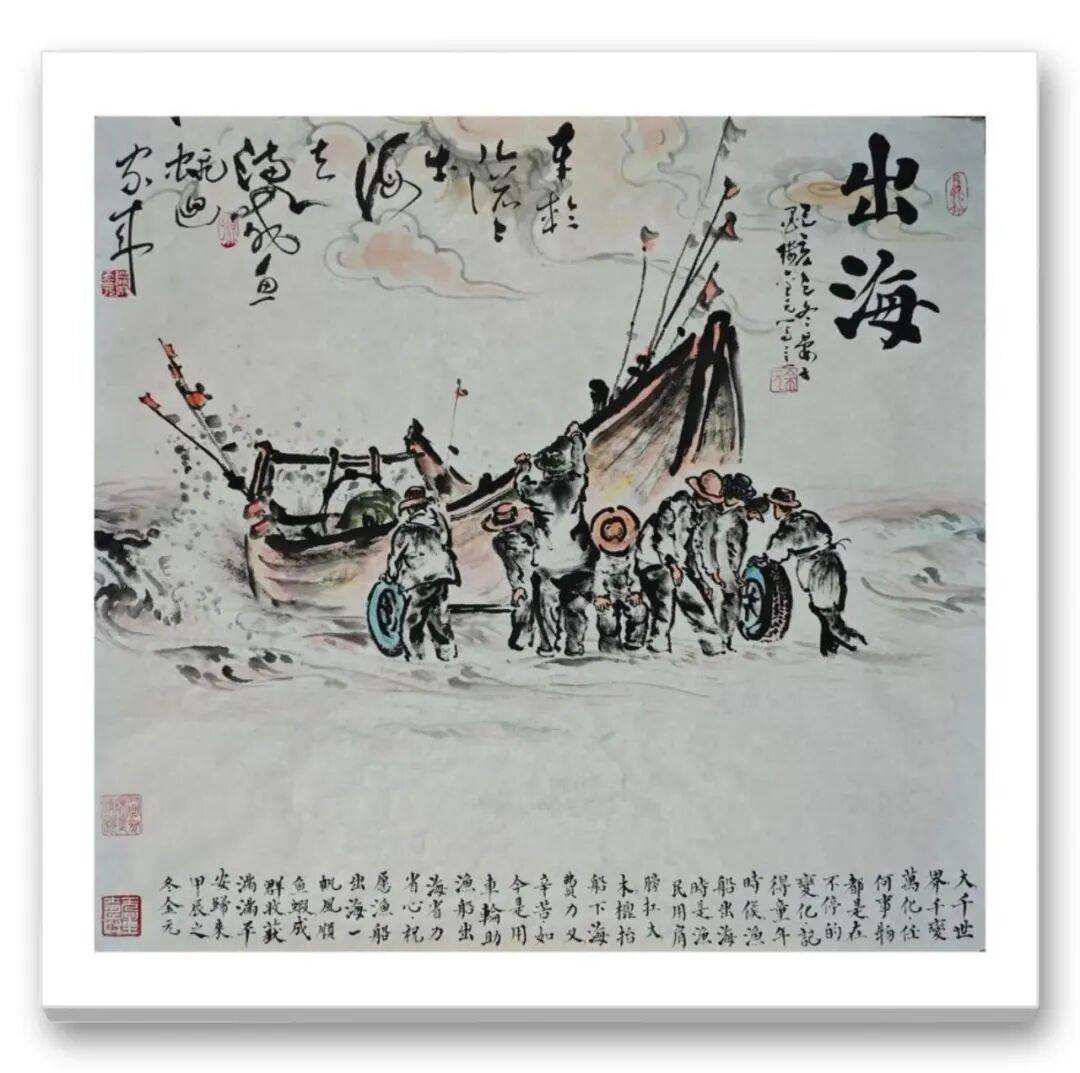 严金元的创作题材始终围绕着岭南的山海与渔樵展开。他笔下的椰林、礁石、渔船、渔人,既是岭南地域风情的生动写照,更是其精神世界的外化表达。在《钓隐》中,孤舟渔父静卧于烟波之上,远山含黛、椰影婆娑,画面营造出“天地孤影任我行”的隐逸之境,传递着艺术家对喧嚣世界的疏离与对精神自由的向往;而在《出海》里,渔民合力推船的场景则充满了生命的张力,海浪的泼墨与人物的动态形成强烈的视觉冲击,展现出岭南人民直面风浪的坚韧与豁达。