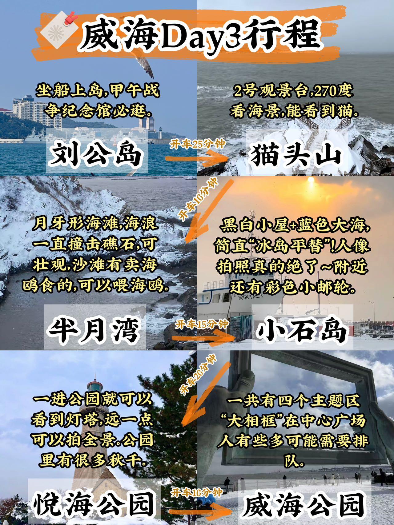 🔗第三天坐船上的刘公岛,甲午战争纪念馆必逛,历史感📝满满。还去了猫头山,2号观景台270度看海景,还去了半月湾、小石岛,人像拍照绝了,紧接着去了悦海公园,一进园就能看到灯塔,远一点📷拍全景更出片,最后去了威海公园,“大相框”拍完打卡照结束一天~