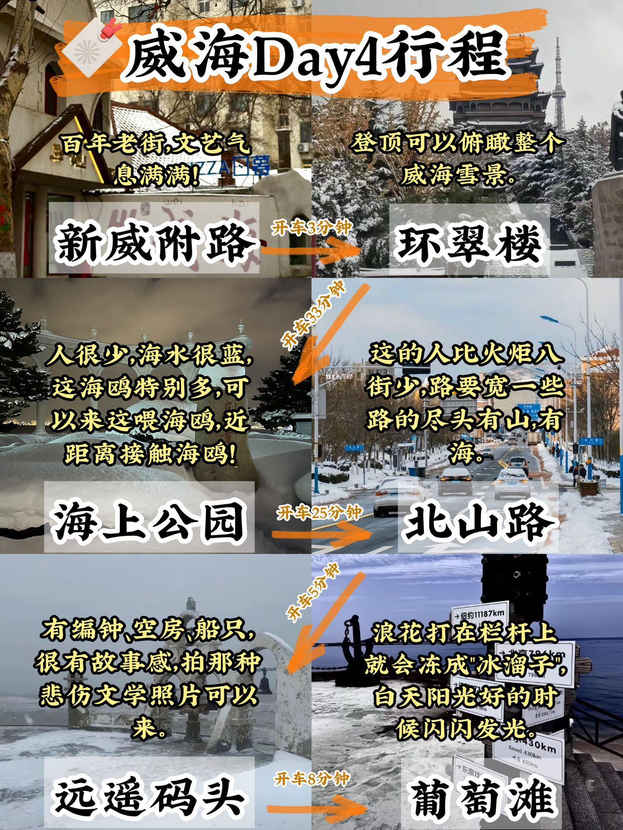 🔗最后一天先去新威附路,百年老街文艺气息拉满,还去到了🏯环翠楼,登顶俯瞰整个威海,接着开车去了海上公园,人少海水蓝🌊,还去了北山路,这的人比火炬八街少,然后开车去遥远码头,故事感直接拉满,最后一站去的葡萄滩,浪花打在栏杆上冻成冰溜子!