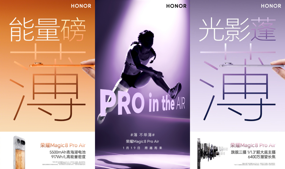 此外,官方还晒出了一张神秘嘉宾的预热海报,并称,“薄,是「轻盈」的姿态;不单薄,是「实力」的答案。TA的跨越,让#Pro in the Air#在此刻具象!#荣耀Magic8 Pro Air#实力见证官,1月19日,神秘嘉宾,跨越而来!”而根据海报上的剪影网友普遍推测,很可能是女子百米跨栏运动员吴燕妮。不过最终还要等官宣确认。