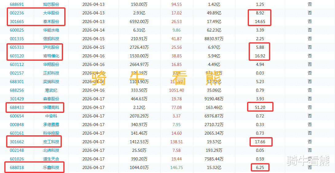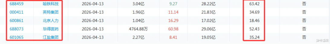 4月13日(周一)哈铁科技解禁比例达到63.42%;英特集团解禁比例达到34.69%;毕得医药解禁比例达到52.43%;江盐集团解禁比例达到35.24%。