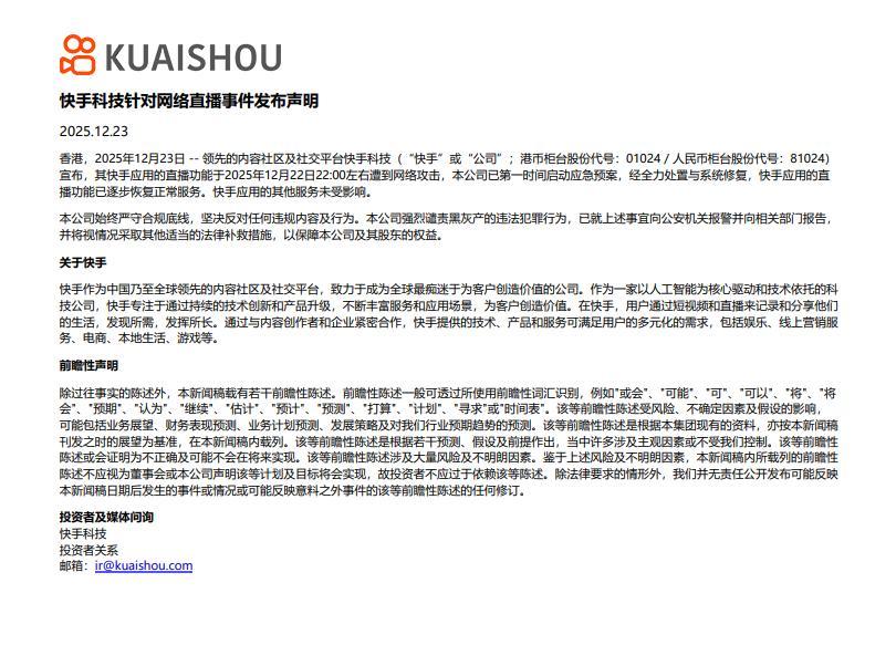 12月23日,快手发布公告表示,经全力处置及系统修复后,平台应用的直播功能已逐步恢复正常服务,其他服务未受影响。