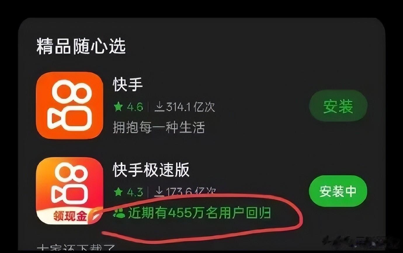 没过多久,快手 App 冲上苹果 App Store 免费榜第二,在某安卓市场,它同样登上热门榜第三。另有网友截图显示,某应用市场疑似迎来超400万用户回归。