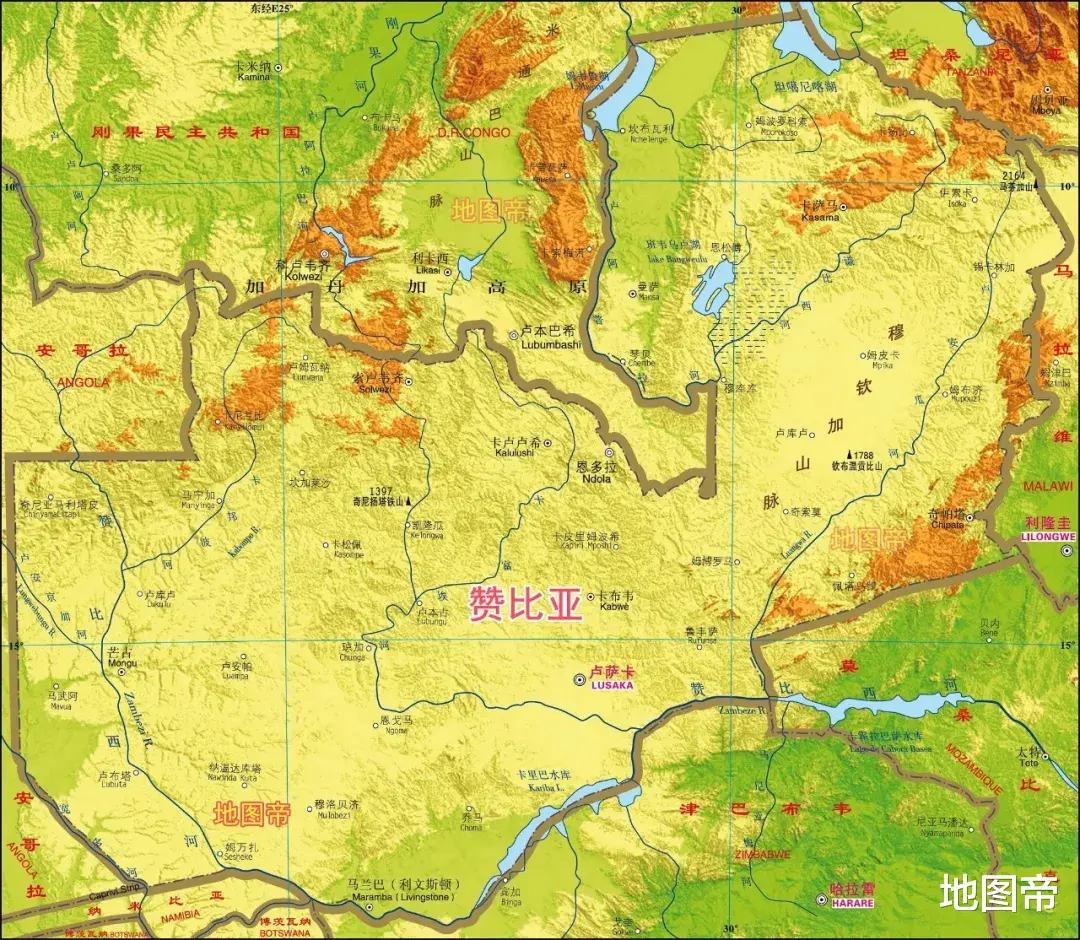 赞比西河发源于加丹加高原,在赞比亚西北部,源头海拔1524米,距刚果(金)不到500米。非洲中部的隆达高原-加丹加高原,是刚果河流域和赞比西河流域的分水岭,也是刚果(金)与安哥拉、赞比亚的天然界线。