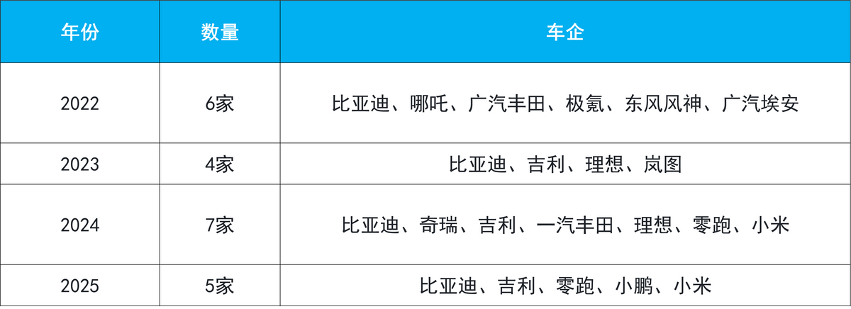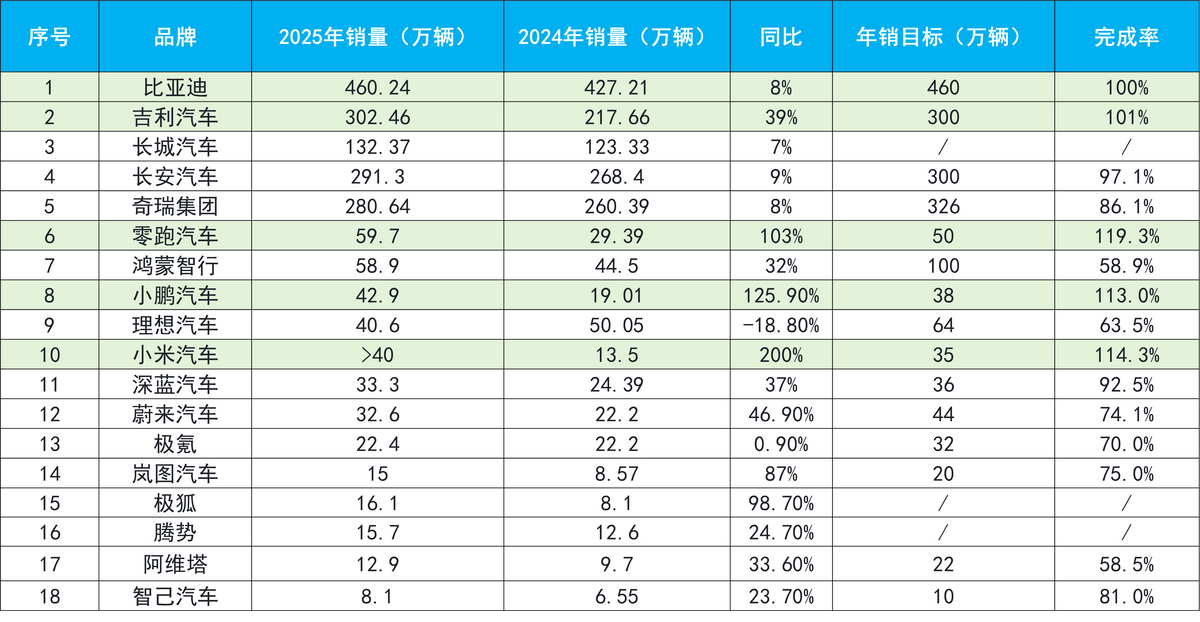 2025年翻篇,各家车企汇总全年销量成绩,不出所料,兑现目标销量承诺的仍旧是极少数:传统车企两家(比亚迪,吉利),新势力三家(零跑,小鹏,小米)。