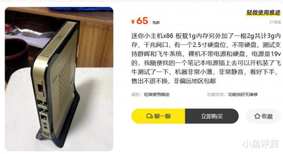 最近看到一个TCL的迷你小主机,写着65元起。卖家描述得很直白:板载1G内存,另加了一根2G,合计3G。一个千兆网口,一个2.5寸硬盘位。不带硬盘和电源,需要自备19V笔记本电源。最大的亮点是,支持群晖和飞牛这类NAS系统。机器本身非常小、薄,而且运行静音。
