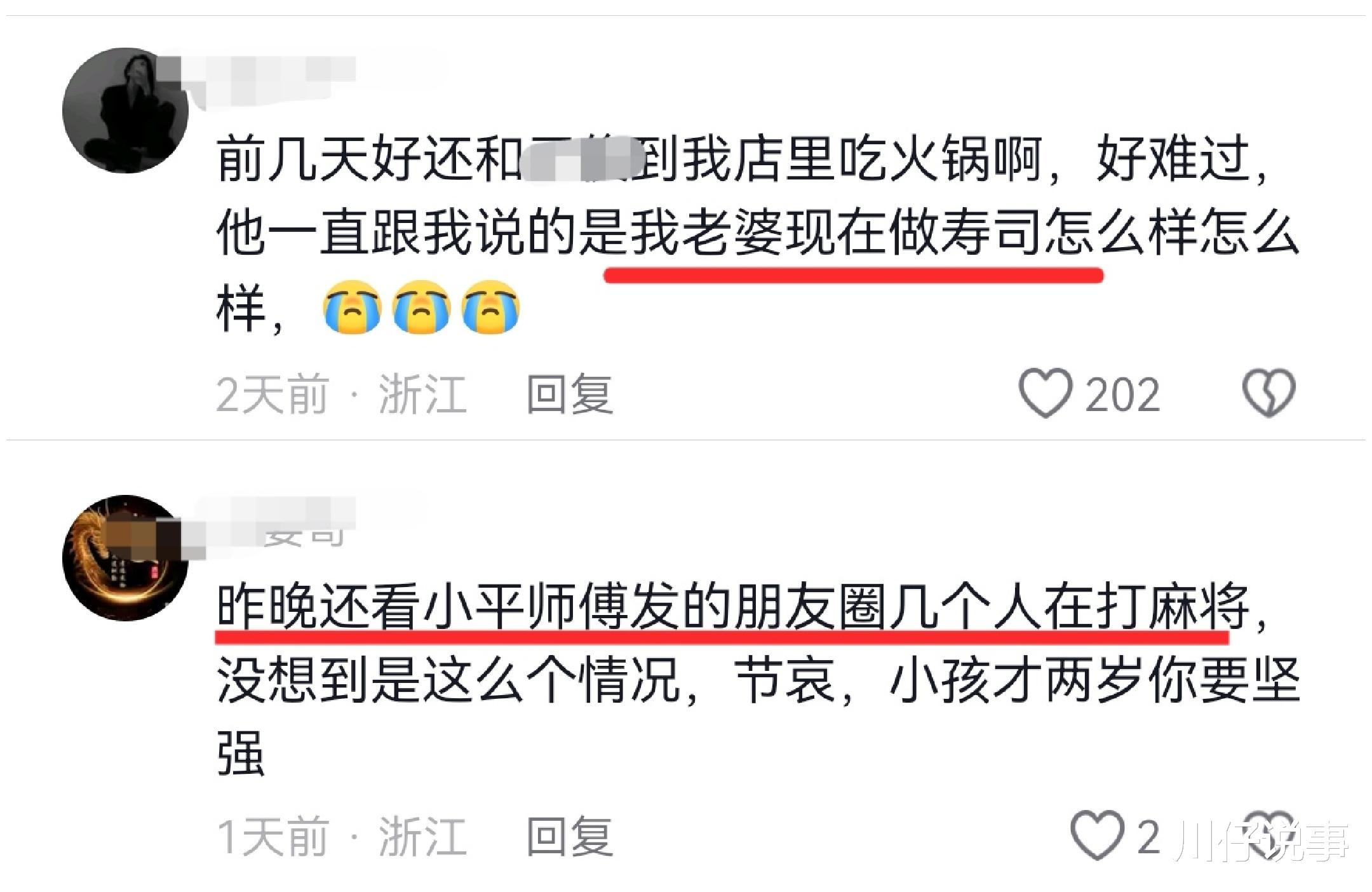 这个动态下面有妻子的留言,看时间是在李其平去世后发的:傻小子,说走就走,希望你在那边没有痛苦没有烦恼。可以猜出来李其平应该是轻生,具体细节没有说。