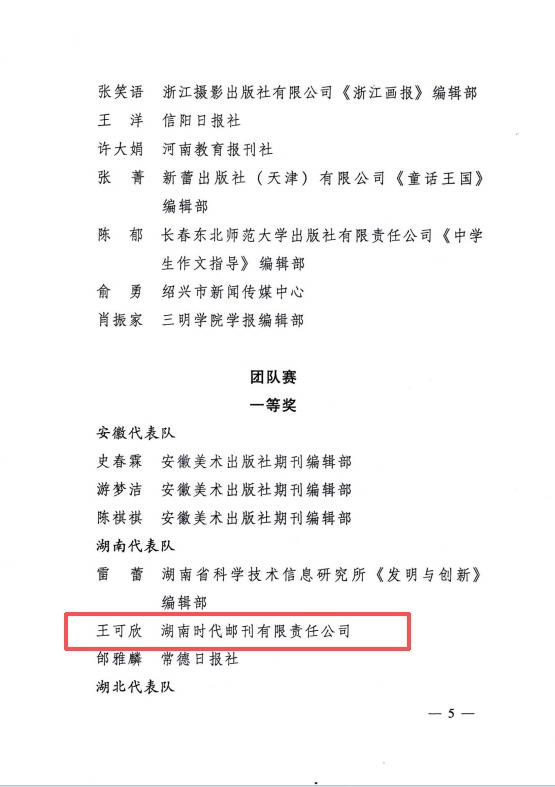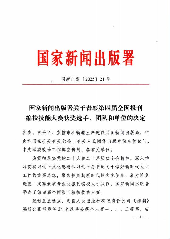 近日,国家新闻出版署正式印发《关于表彰第四届全国报刊编校技能大赛获奖选手、团队和单位的决定》(国新出发〔2025〕21号)。由《时代邮刊》编辑王可欣参与组成的湖南代表队,凭借扎实的专业功底和出色的现场表现,荣获大赛团队一等奖。