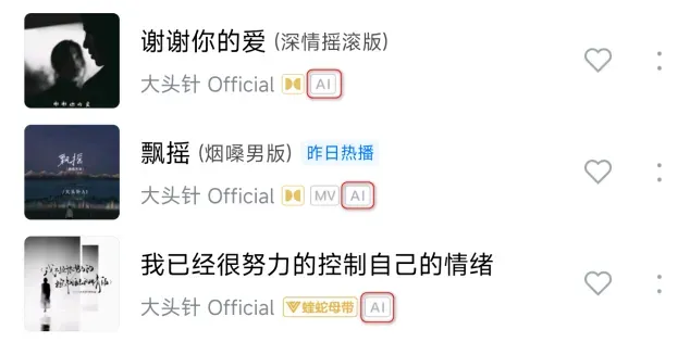 而咱们单纯根据4个大头针的名字推测,某水和某易的“大头针”或许是AI,或许是真人(目前都还没锤),某酷和某Q的“大头针 Official”,肯定是AI!