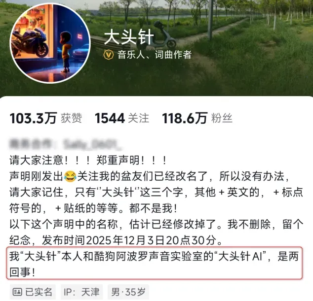 但!是!值得注意的是,在某音这边,大头针已经发出过声明:自己和酷狗阿波罗声音实验室的“大头针AI”不是一回事。
