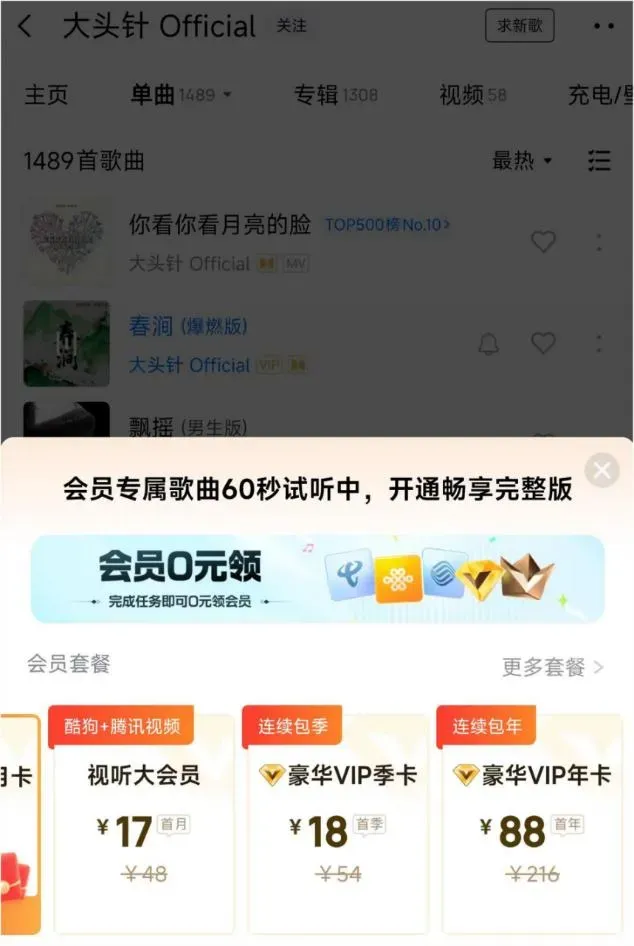 这就导致,有人为了听完他的歌,专门花88块钱在某酷音乐上开一个年度会员。