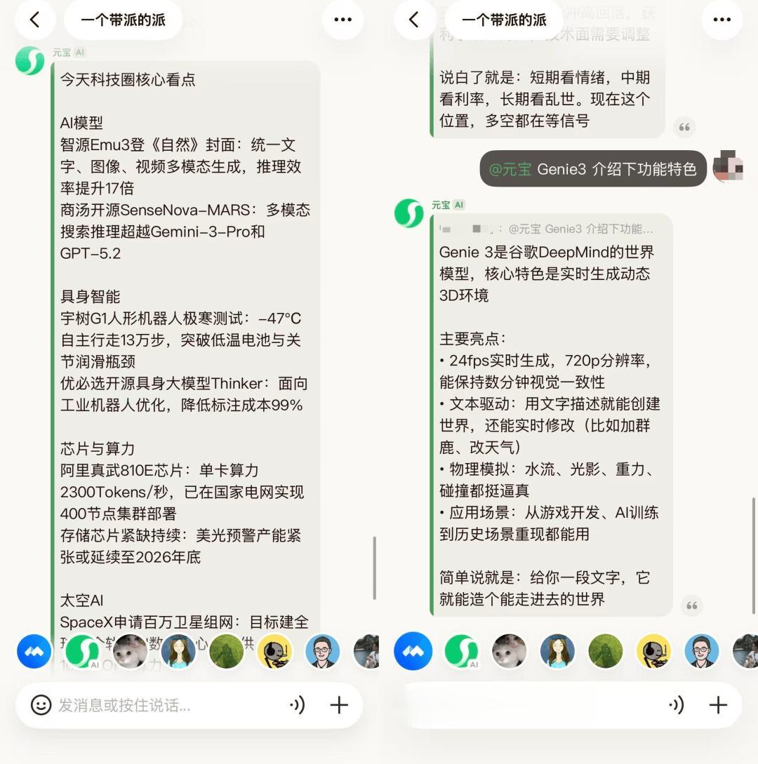但在派里的元宝,就更人味了,能用三言两语回复的,绝不啰里吧嗦,我个人是很喜欢这种言简意赅,其实在微信里的元宝机器人也被训练成了这种「搭子」人设,相当讨喜。