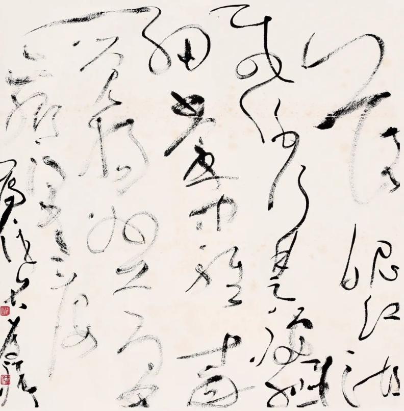 第二类作品就是发展了古人、有创新的作品,特别是在章法、墨法上创新的作品。比如王铎、傅山等人的作品,大多都是一行一行的,现在的大草作品,就要把章法打乱,不再是以行列为单位,敢于“乱石铺街”,以章法为节奏。
