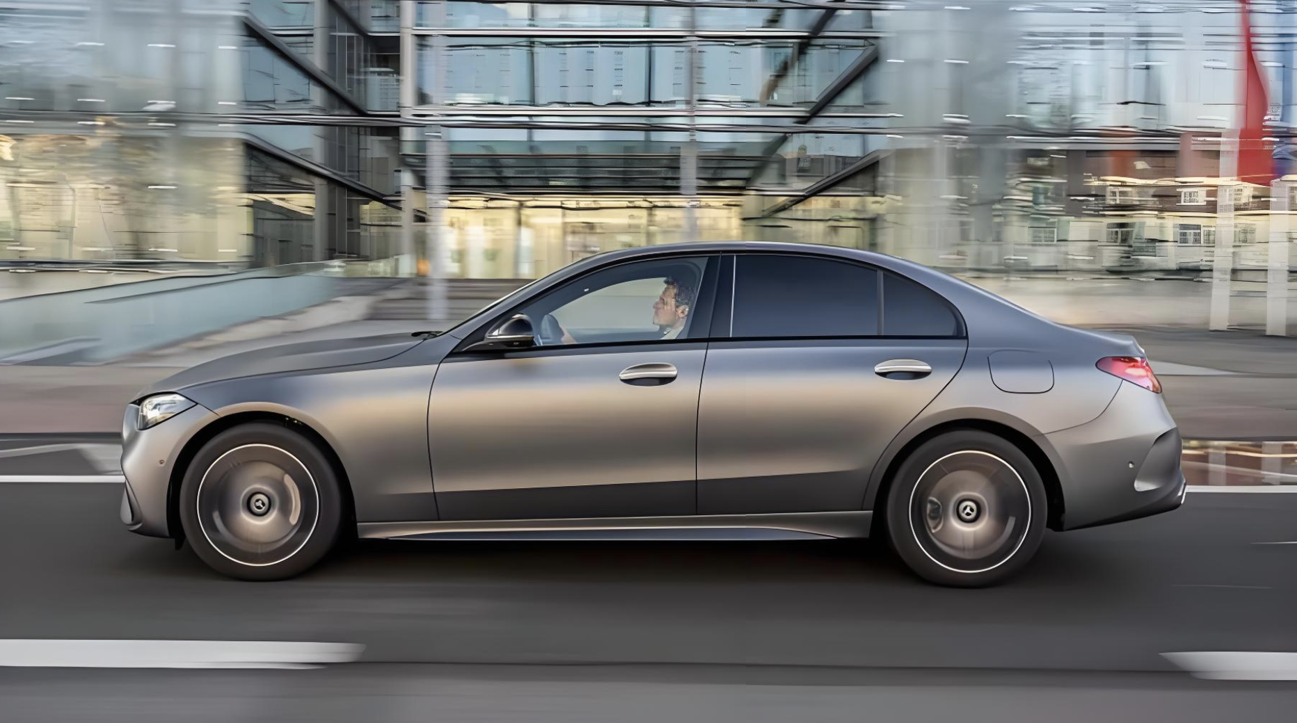 来到车身侧面,纯电奔驰C级依旧采用了经典的三厢车身设计,倾斜的A柱、弧线形的车顶与溜背式的线条一气呵成,车窗四周加入了银色的装饰边框,加宽的黑色B柱与全车黑色隐私玻璃融为一体,车身四周加入了隐藏式车门把手,并配备了无边框车门,配备了18英寸的熏黑轮圈,匹配了225/45 R18、245/40 R18规格的轮胎,车尾造型更加激进,车尾配备了上翘的黑色碳纤维后扰流板,搭配着黑色底部扩散器和双边四出的矩形镀铬排气,具有更强的运动气息。贯穿式的黑色灯罩两侧融入了四个圆形的尾灯,中间还有银质的奔驰尾标,辨识度很高。