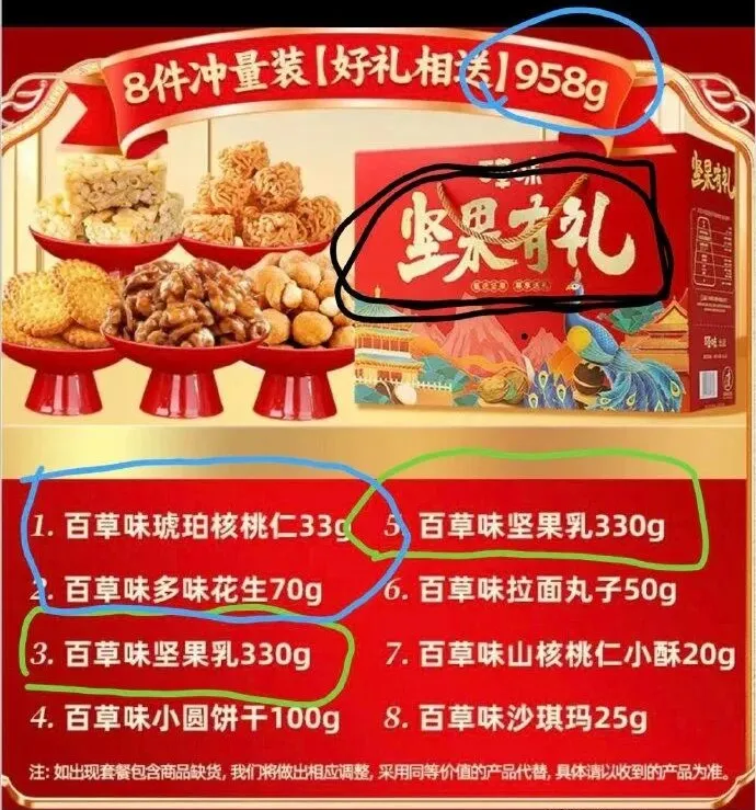有网友发现在某网购平台售卖的一款“百草味坚果大礼盒”,宣传重达958克,但其中有660克是饮料,还有部分是饼干零食,算得上是真正坚果的核桃仁只有33克。
