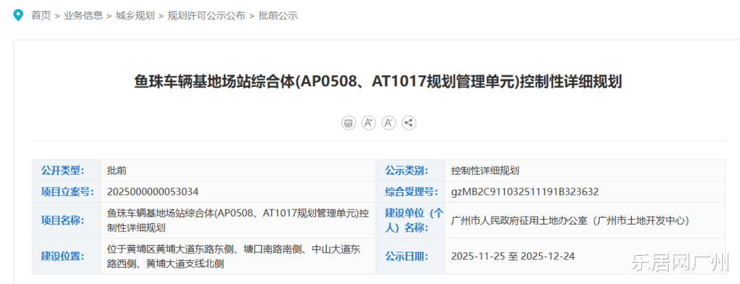近日,广州自规局发布鱼珠车辆基地场站综合体(AP0508、AT1017规划管理单元)控制性详细规划。