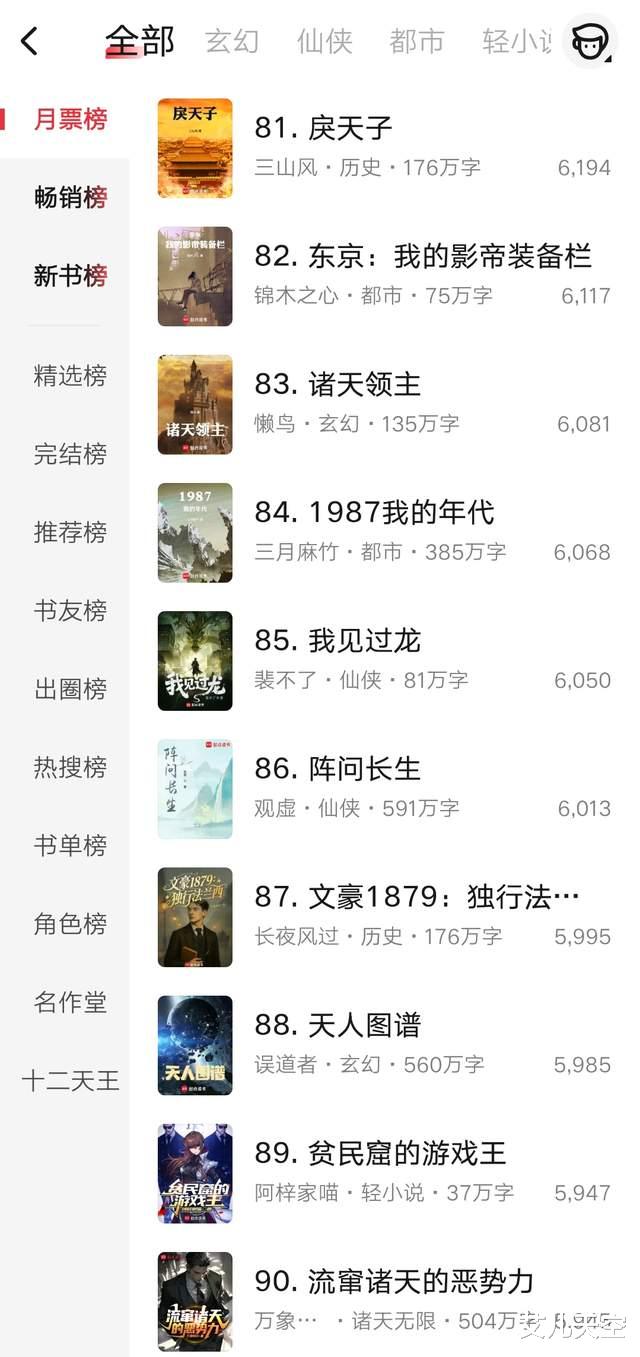 第81到90名,三山风的《戾天子》又从百名开外升了回来。