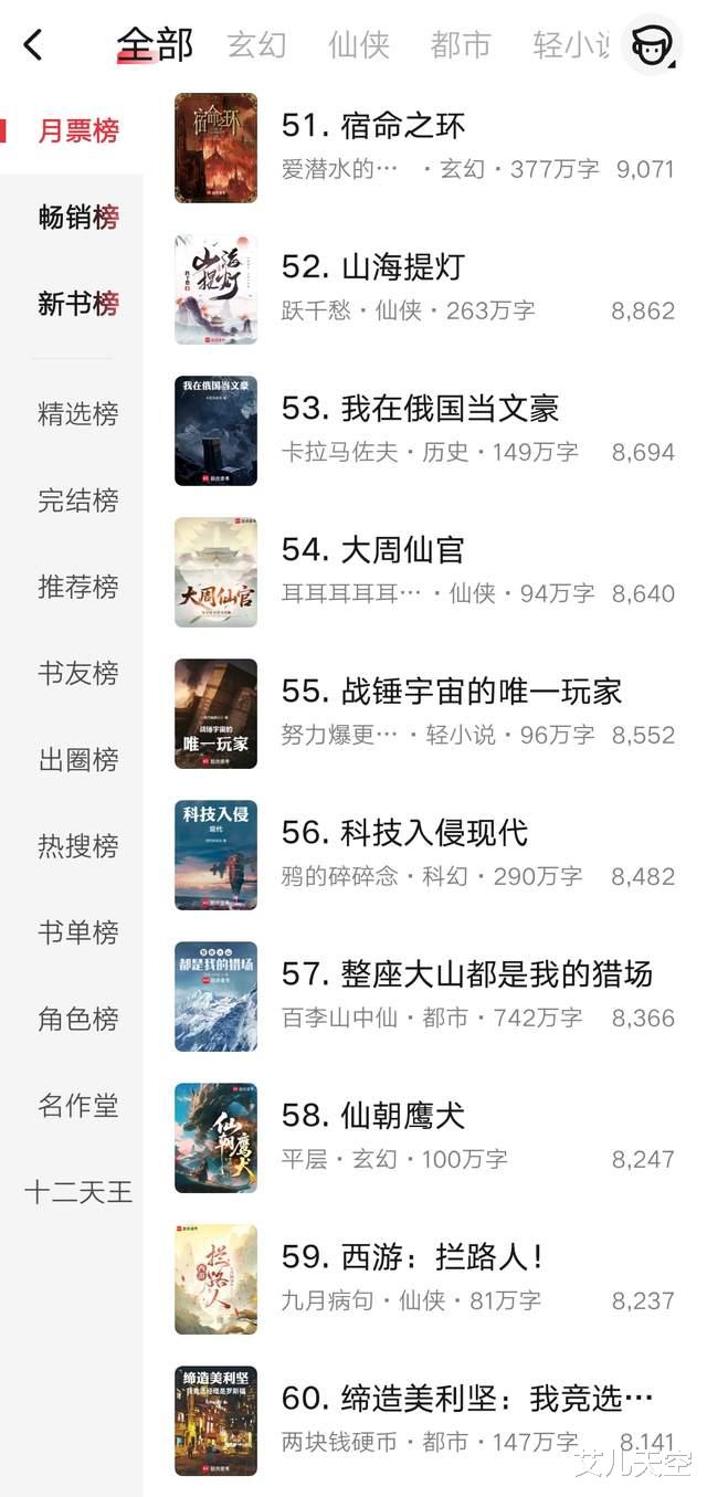 第51到60名,跃千愁的《山海提灯》排名提升最多,从之前的第63名升到了第52名,再过一个月小说就写了两年了。