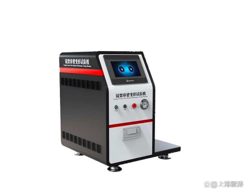 【设备原理与结构】镜架鼻梁变形试验机是专用于测试眼镜架鼻梁部位抗疲劳性能的精密仪器,其核心工作原理是通过模拟人体佩戴眼镜时的周期性受力状态,采用伺服电机驱动机械臂对镜架鼻梁部位施加0.5-5N可调节的往复压力。