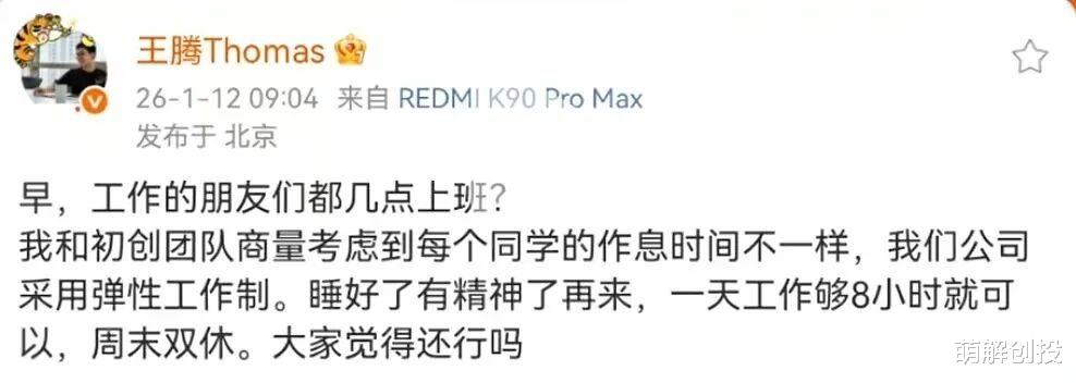 1月12日,小米中国区前市场部总经理王腾发微博表示,他创立的“北京今日宜休科技有限公司”采用弹性工作制,睡好了有精神了再来,一天工作够8小时即可,周末双休。原文如下: