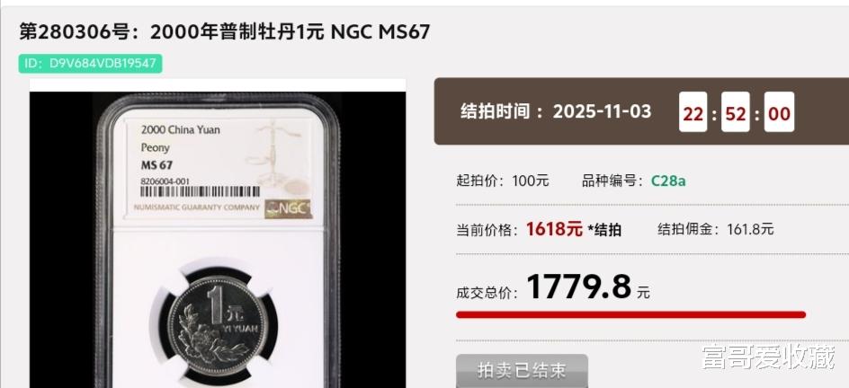 在2025年11月3日的“钱币拍卖会”中,一枚2000年的“牡丹1元”(普制币),其NGC评级分数为MS67分,最后拍出了1779.8元。
