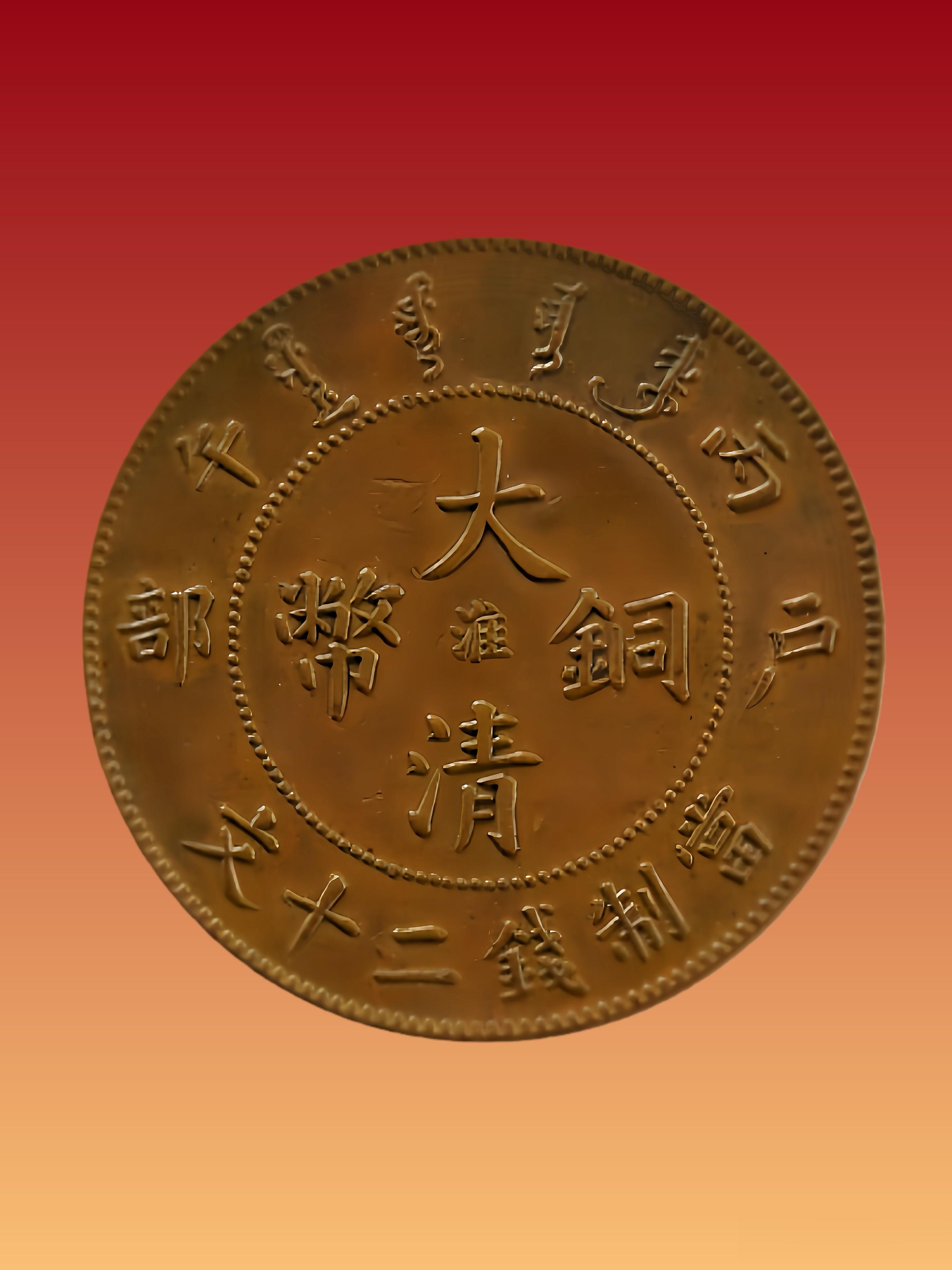这枚大清铜币红铜质地,色泽呈暗红色,包浆自然温润。钱币直径约 3.4 厘米,厚度约 0.2 厘米,形制规整,边缘有齿纹,质地厚重。正面中央铸有 “大清铜币” 四字,珠圈环绕,上缘铸有 “丙午” 干支纪年,下缘铸有 “当制钱二十文” 面值,两侧铸有 “户部” 二字。背面中央铸有蟠龙图案,龙纹清晰精美,鳞爪分明,气势磅礴,上缘铸有 “光绪年造” 四字,下缘铸有英文 “TAI-CHING-TI-KUO COPPER COIN”(大清帝国铜币)。