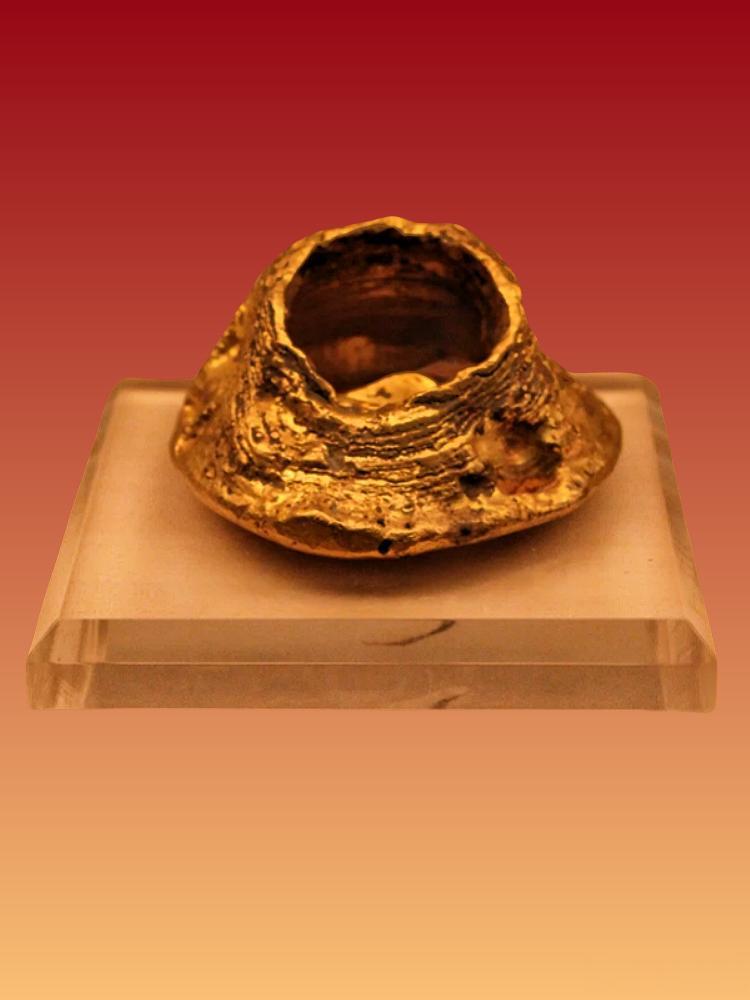 这枚马蹄金纯金质地,色泽金黄纯正,光泽柔和。整体呈椭圆形,底面为圆形,内凹中空,状如马蹄,器型规整,线条流畅。器身经精细锤击与打磨,表面光滑细腻,无明显瑕疵,体现了汉代高超的黄金加工工艺。马蹄金重量约 250 克,与汉代 “一斤” 重量相符,底部刻有隐晦的重量标记,便于计量使用。