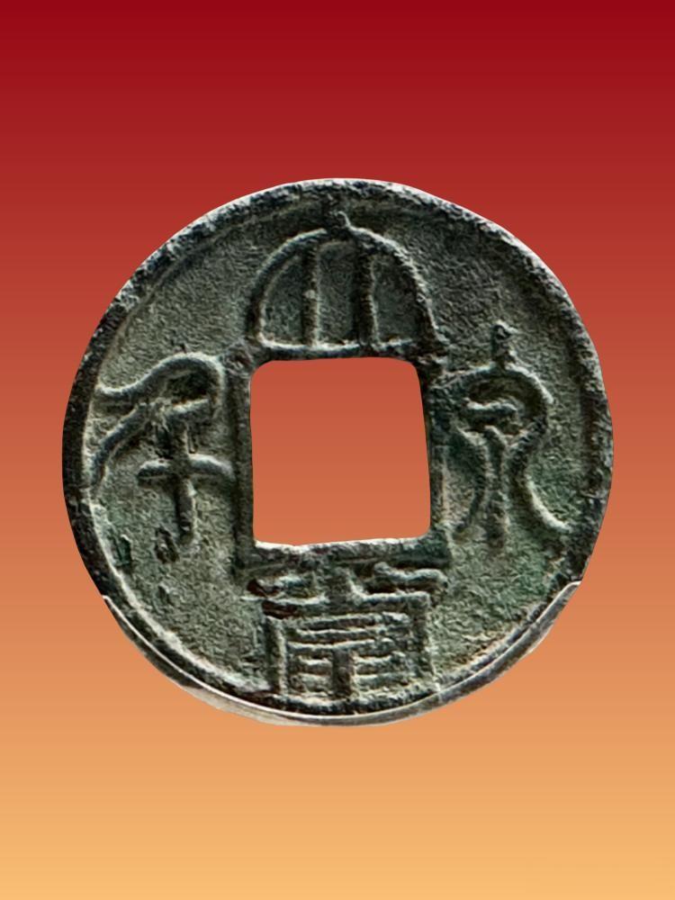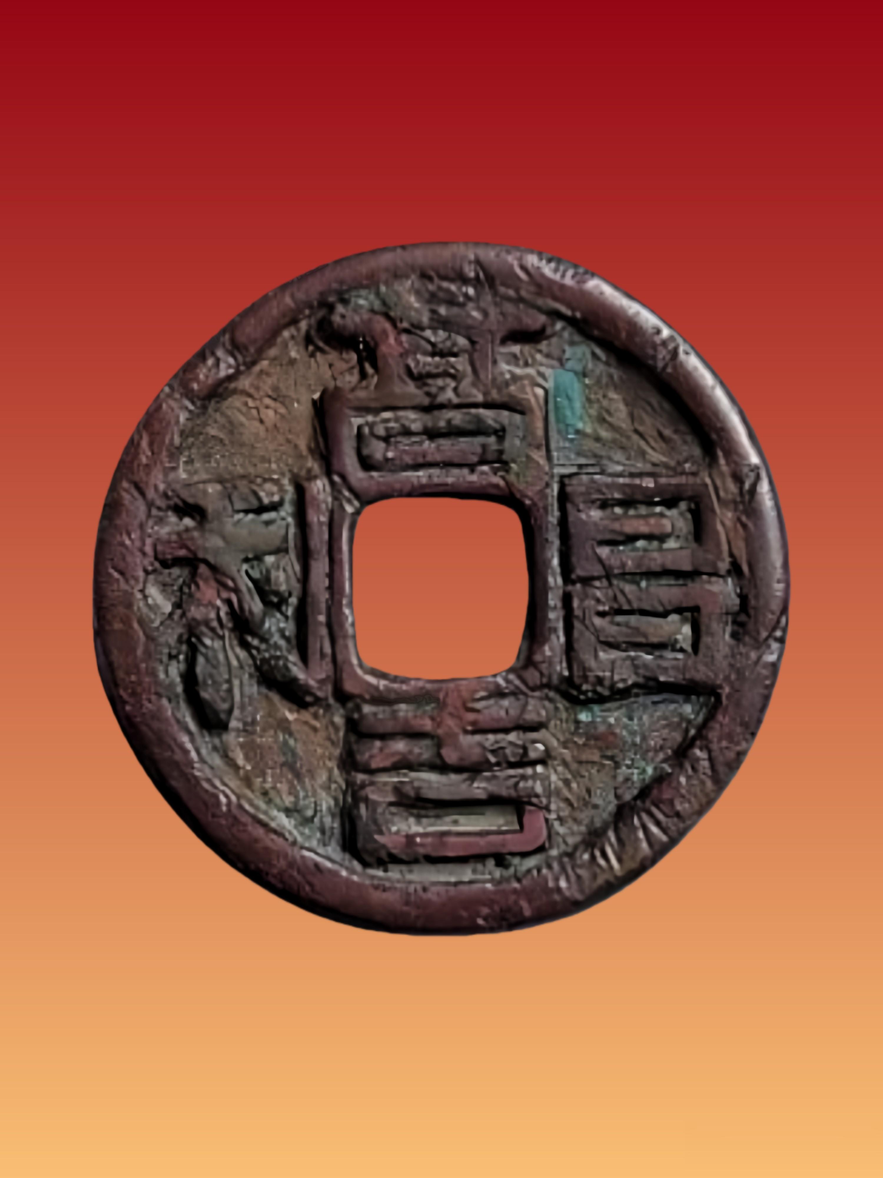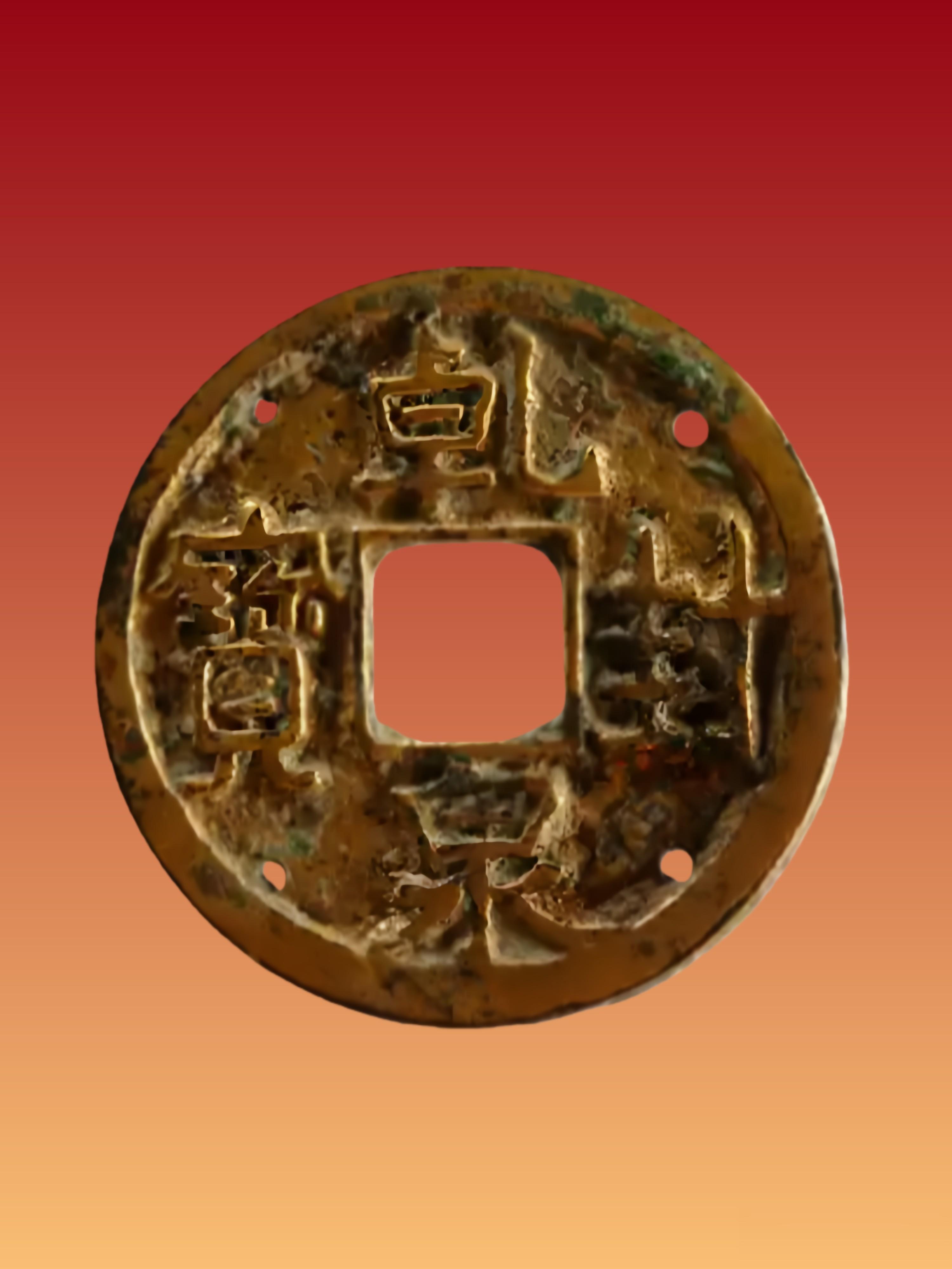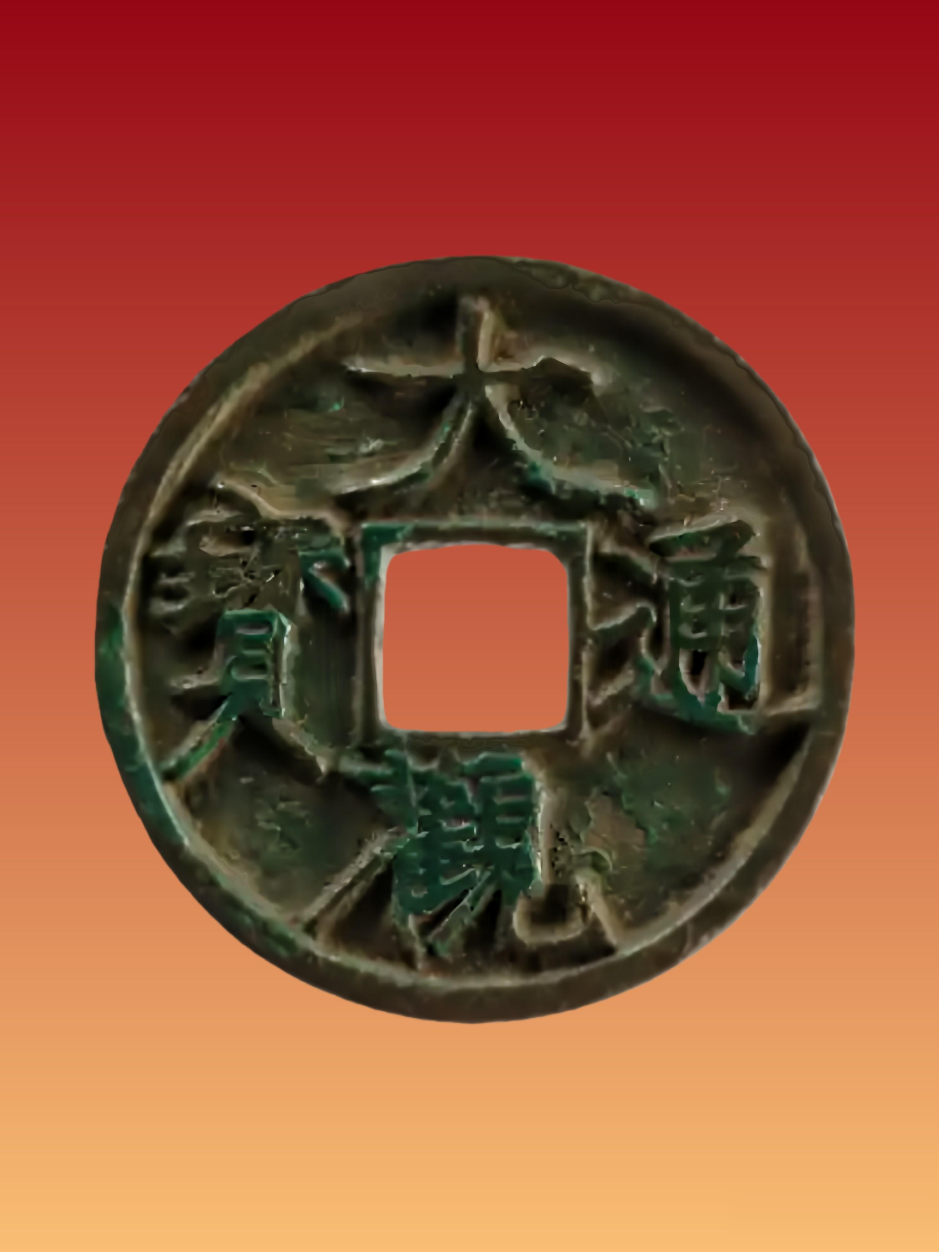 14、 大观通宝(折五)大观通宝(折五)是北宋徽宗大观年间(公元 1107-1110 年)铸造的年号钱,“折五” 表示一枚可当五枚小平钱流通,是北宋钱币中的精品。宋徽宗赵佶书法造诣极高,自创 “瘦金体”,大观通宝的钱文便是其瘦金体书法的代表作,兼具货币功能与艺术价值。