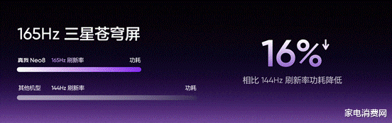极致性能需要顶级屏幕来呈现。真我Neo8携手三星显示全球首发165Hz三星苍穹屏,采用M14旗舰发光材料,发光能效提升26%,165Hz功耗相比行业144Hz降低16%。