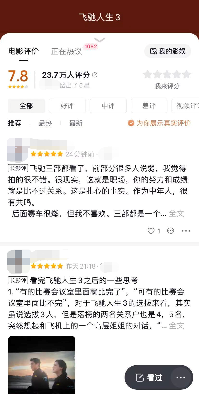 与票房一起领跑的还有口碑。超长篇幅的赛车高燃赛场,配上更成熟的叙事,将#飞驰人生3春节档口碑领跑 、#飞驰3沈腾尹正MVP结算 等话题送上抖音热搜,引发大面积讨论,24.3万网友为影片打出7.8的抖音评分,目前在春节档新片中位列首位。