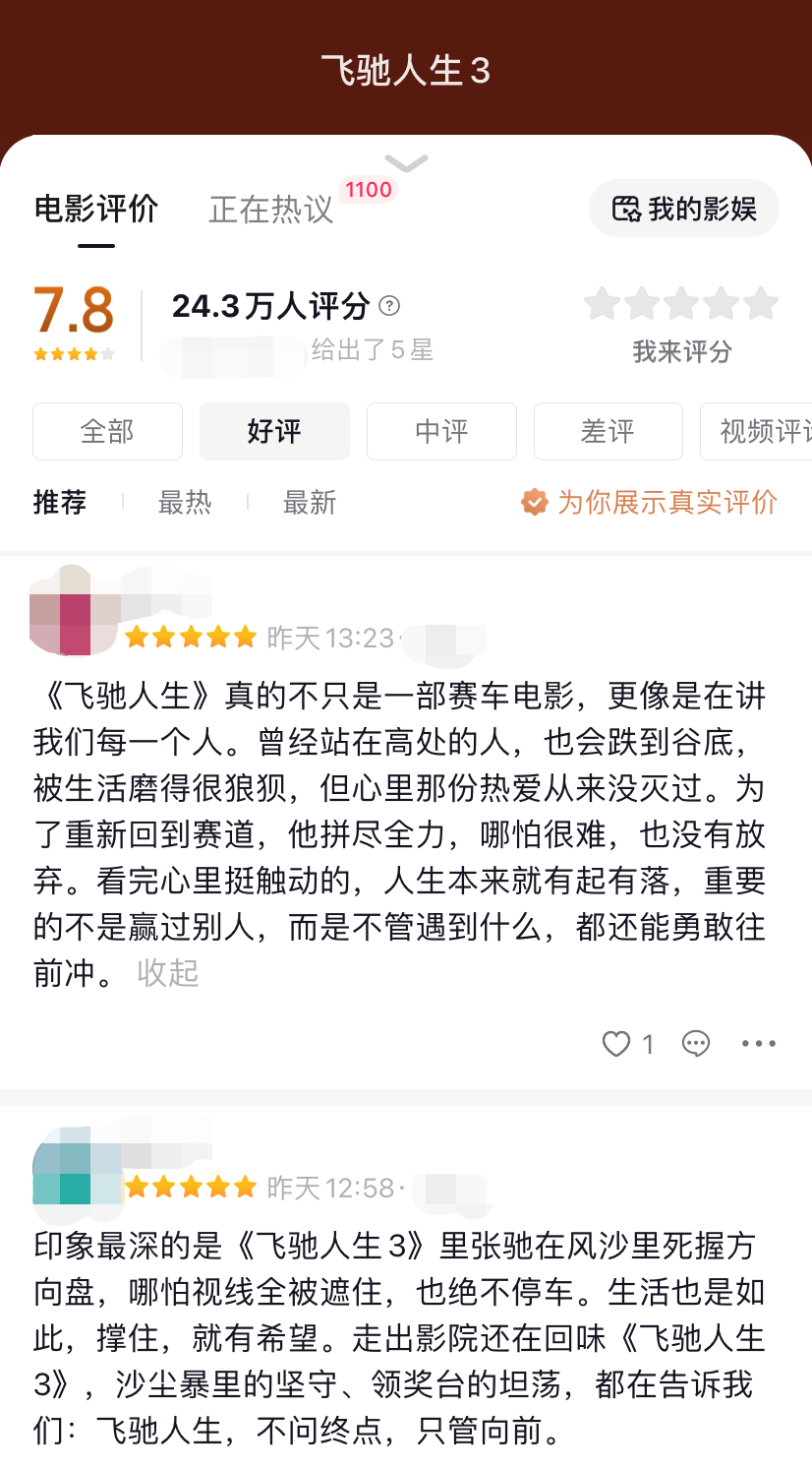 当然,如果只有燃点和笑点,《飞驰3》大概率不会如此迅速地跑出断崖领先的优势,影片能够引发共鸣的关键还在于人。“《飞驰3》真的不是一部赛车电影,更像是在讲我们每一个人。”抖音用户@周**0 的评论一语中的。