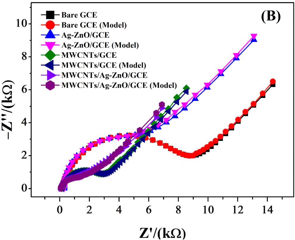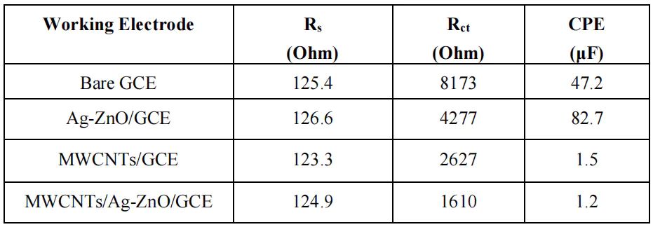 图8 Bare GCE对应着最大的Rct,MWCNTs/Ag-ZnO/GCE对应着最小的Rct。DOI:10.3390/molecules28010049