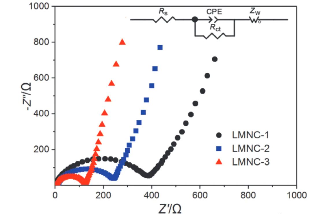 图9 LMNC-1、LMNC-2和LMNC-3材料循300圈后的Nyquist曲线。DOI:10.6023/A20070319