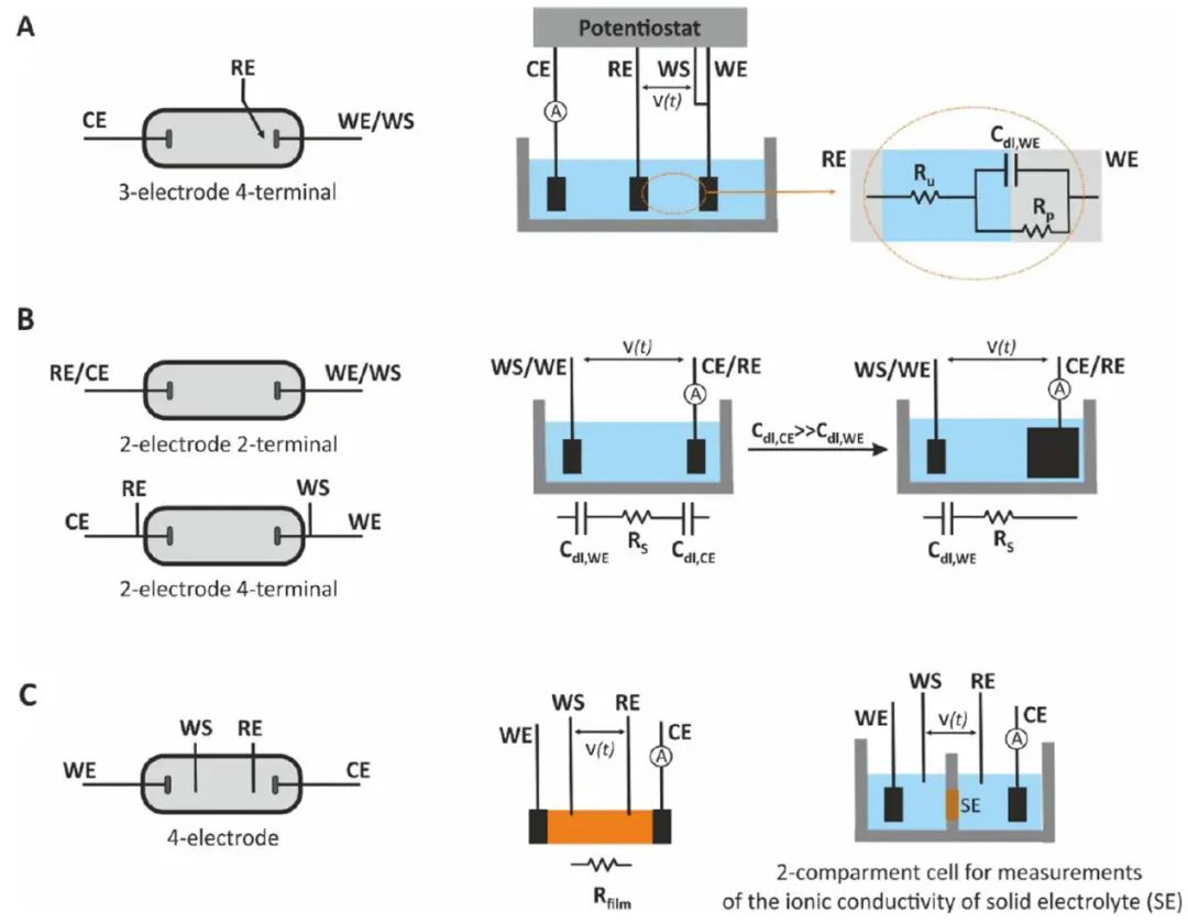 在EIS实验中存在两电极、三电极和四电极配置,最常见的电化学设置是指由工作电极(WE)、参比电极(RE)和对电极(CE)组成的三电极配置。不同电极配置得到代表不同的物理意义的阻抗。