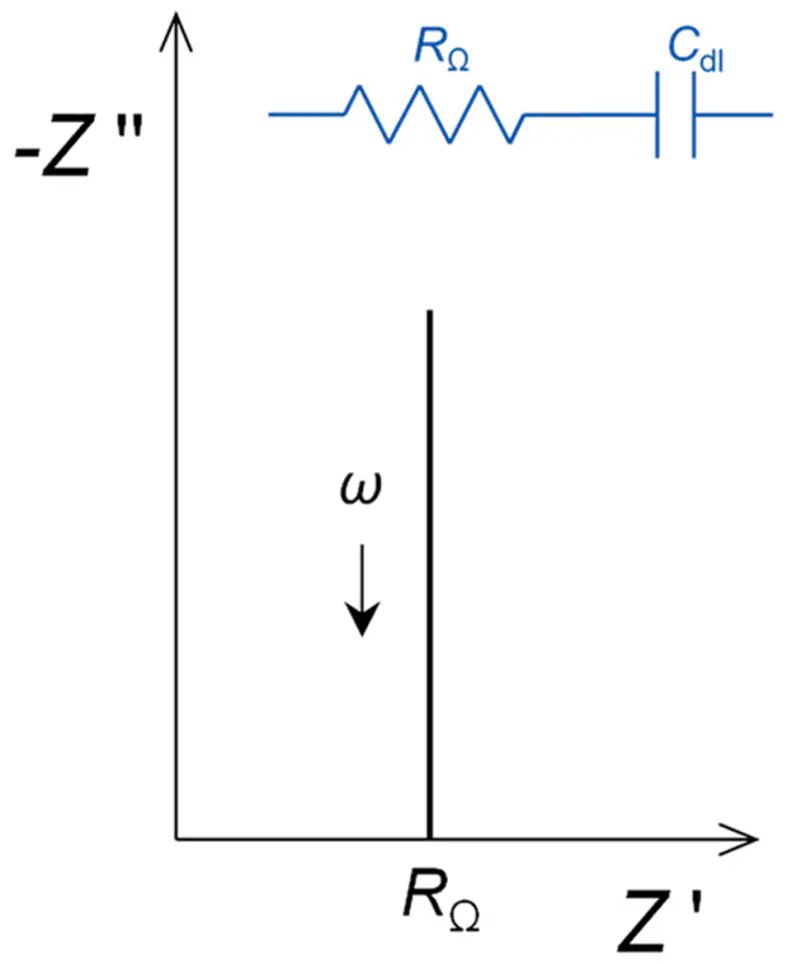 等效电路元件是一个电容器,在这种情况下,完整的等效电路RΩ是与双层电容Cdl串联。阻抗图是一个垂直的直线,如下图所示,其阻抗分量由以下给出:
