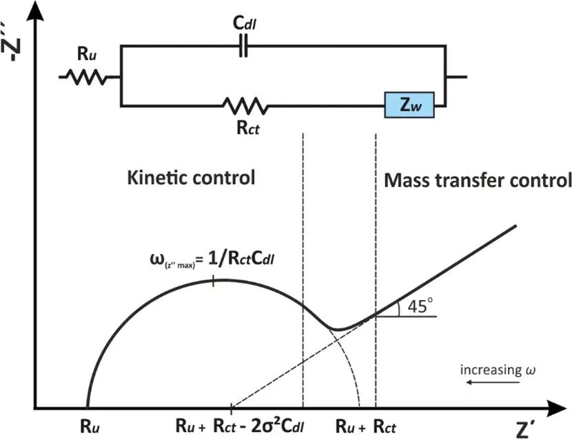 在某些情况下,可以发生高频率的动力学控制,但由于时间尺度较长,在低频下电荷转移速率由溶液中物种的扩散控制。扩散控制表现为Warburg阻抗,Zw,并对应于复平面上相位角为45°的线。