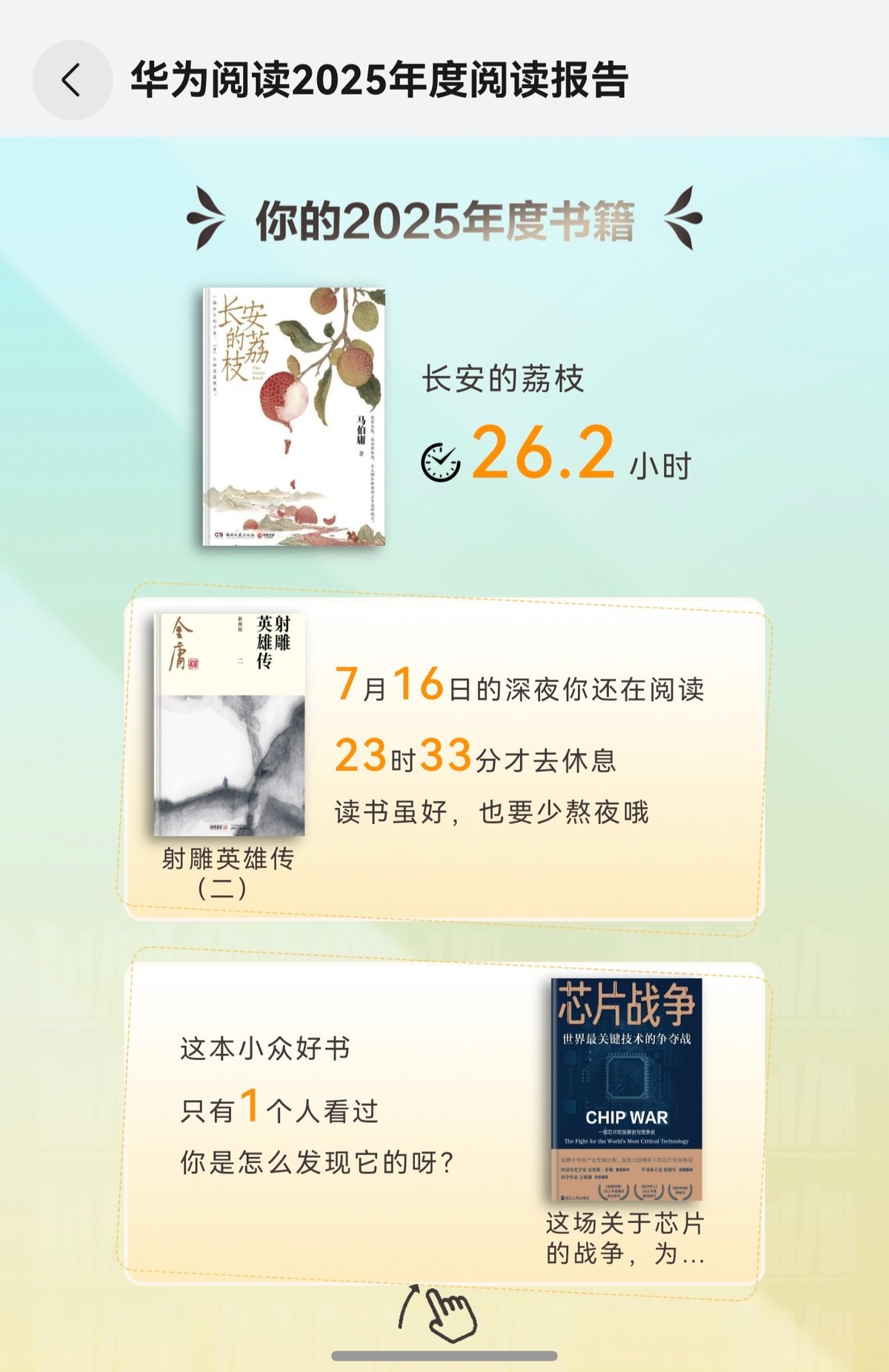 在报告里,阅读数量、累计阅读时长和年度书籍都列得一清二楚。看完我都惊了,今年我都忙成这样了,居然还忙里偷闲看了这么多书!连华为阅读都劝我:“读书虽好,也要少熬夜哦”,这话看着让人怪暖心的。连我看过的一本超小众书籍,华为阅读也给我列了出来,让我忍不住又想起“当时我是咋找到这本的来着?”