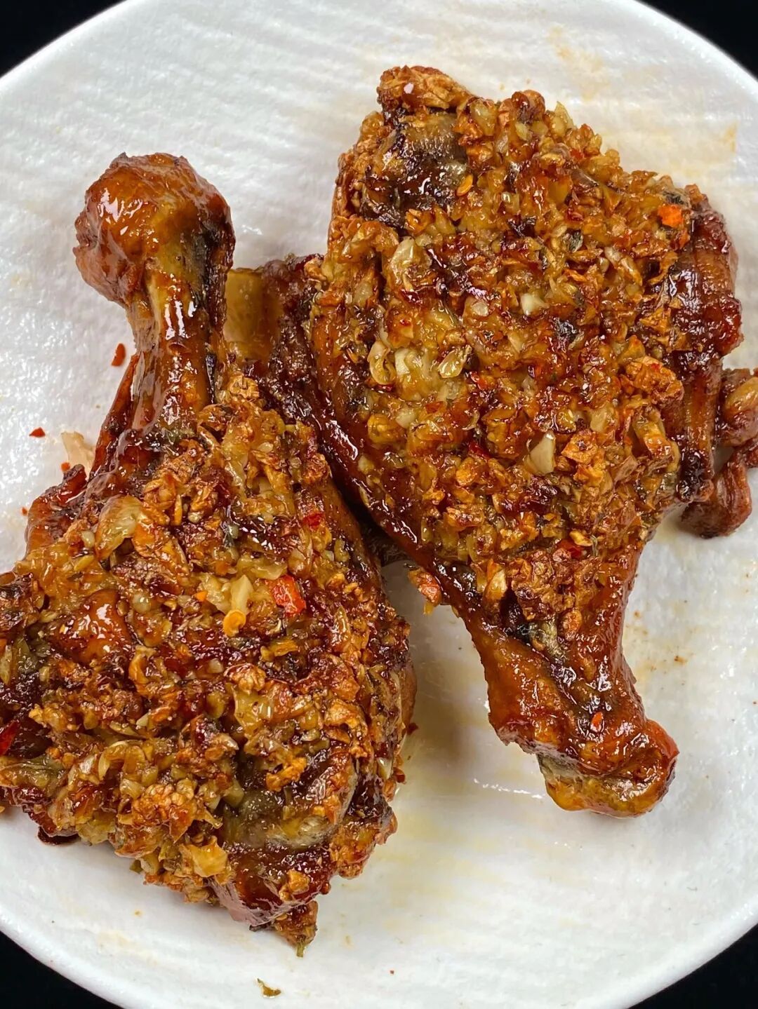 鸡腿腌制后放入炸锅,180度烤10分钟,翻面再烤10分钟,加入黄油蒜末再烤10分钟,香气四溢的鸡腿就完成了,表皮酥脆内里多汁。