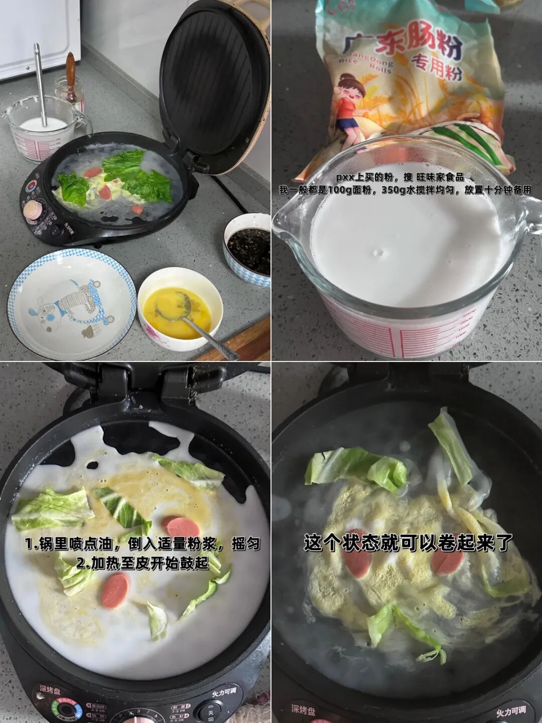 它还能做肠粉。买点专用的肠粉粉,加水调成浆,倒在预热好的电饼铛里面,加上自己喜欢的配料,几分钟后一份地道的肠粉就完成了。简直能气死肠粉店老板。