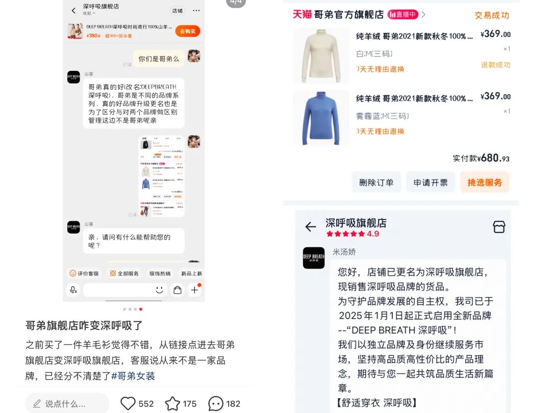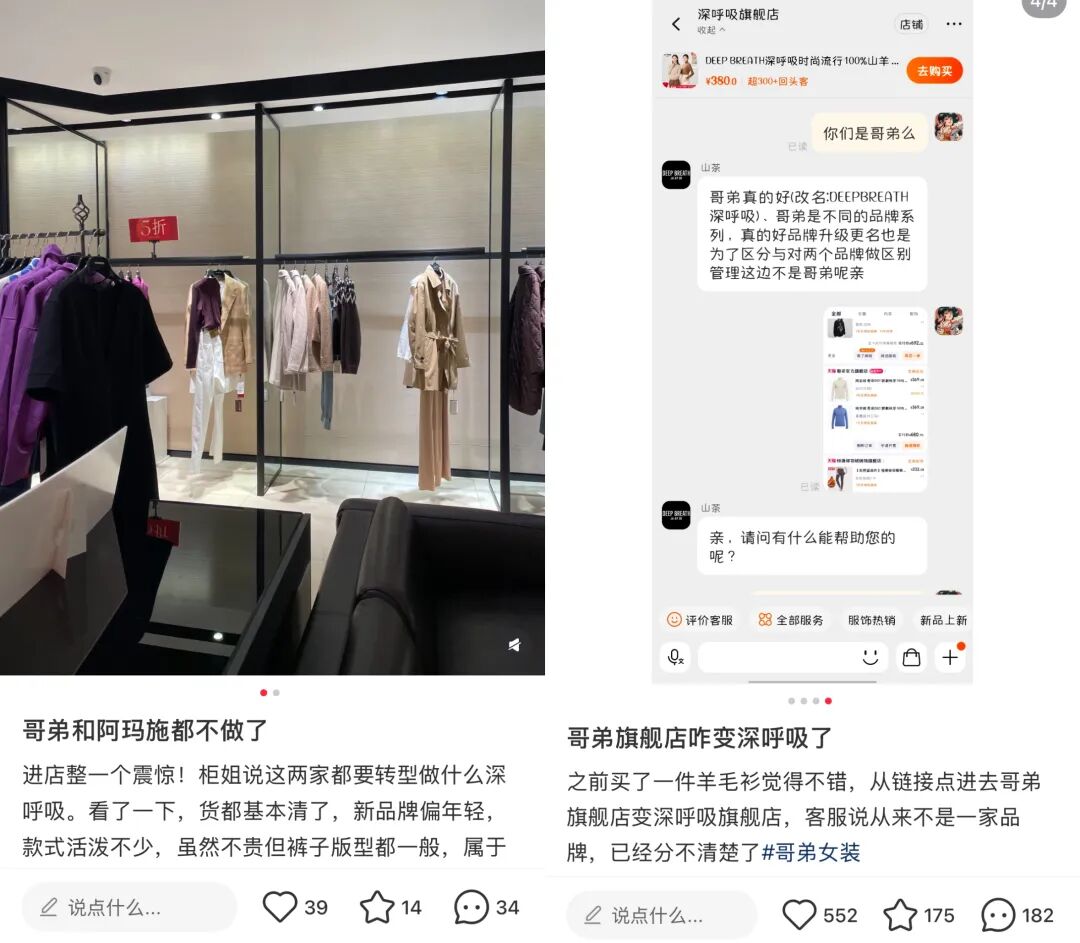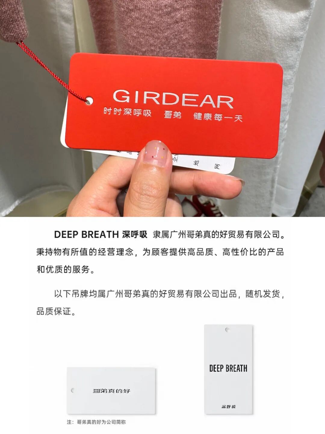 更有细心的消费者发现,哥弟自2025年起启用的新吊牌上,悄悄印上了“时时深呼吸”的字样;而另一边,“深呼吸”衣服的吊牌上也还存在“哥弟真的好”的痕迹。两个品牌剪不断理还乱的关联,让不少老顾客一头雾水。