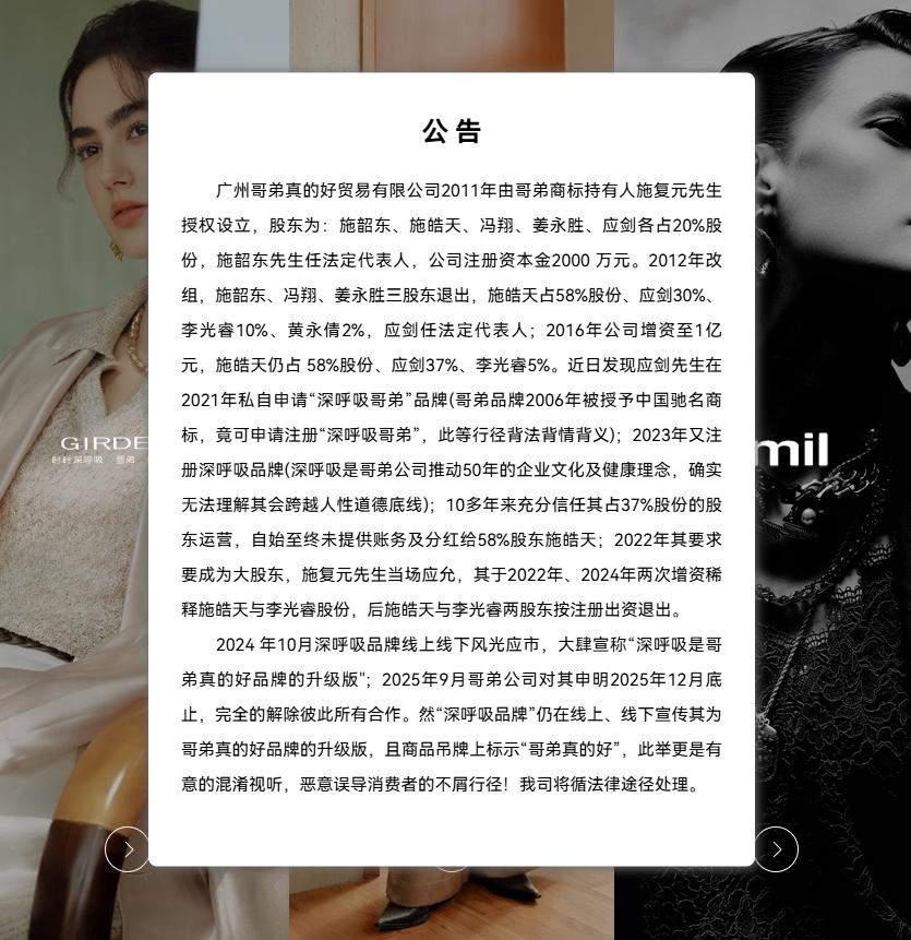 由于哥弟公司单方面将“哥弟真的好”剥离出自身体系,深呼吸母公司回应声明称:“鉴于双方经营理念上出现根本分歧,为守护品牌发展的自主权,我司决定于2025年1月1日起停止使用‘哥弟真的好GIRDEAR’商标,启用全新品牌‘DEEPBREATH深呼吸’,独立运营”。