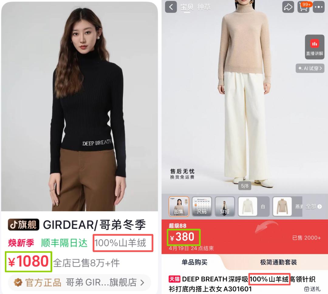 在电商平台上,款式相似、面料相同的一件100%山羊绒上衣,哥弟卖1080元,深呼吸(原哥弟真的好)只卖380元。