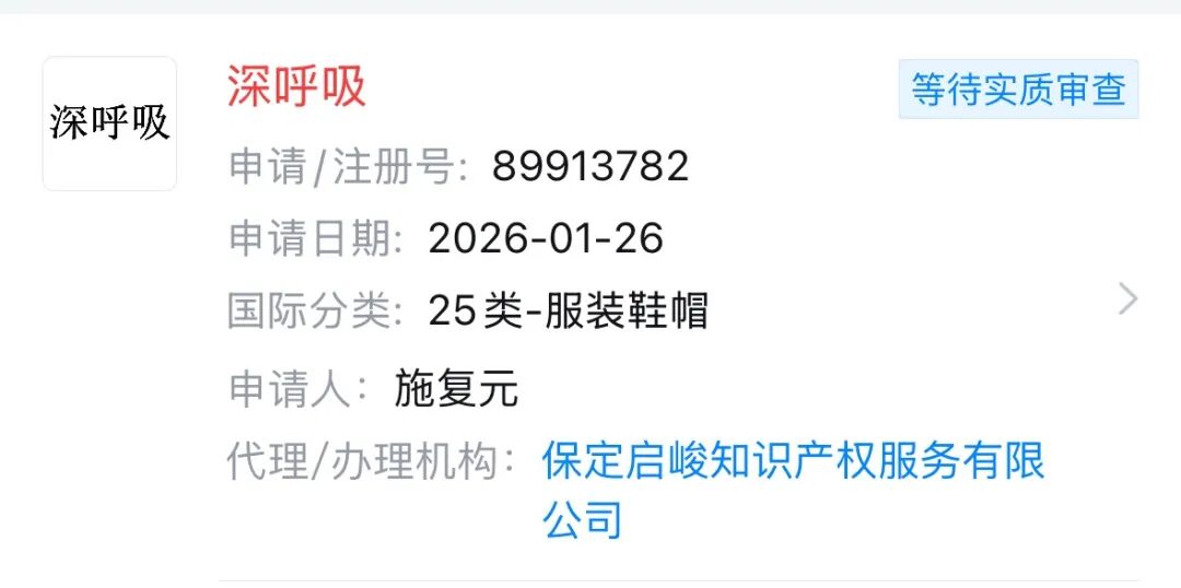 有意思报告注意到,2026年,哥弟品牌创始人施复元想要拿回“深呼吸”商标,天眼查App显示,其在1月提交了第25类商标申请,截至4月16日,商标状态仍为等待实质审查。