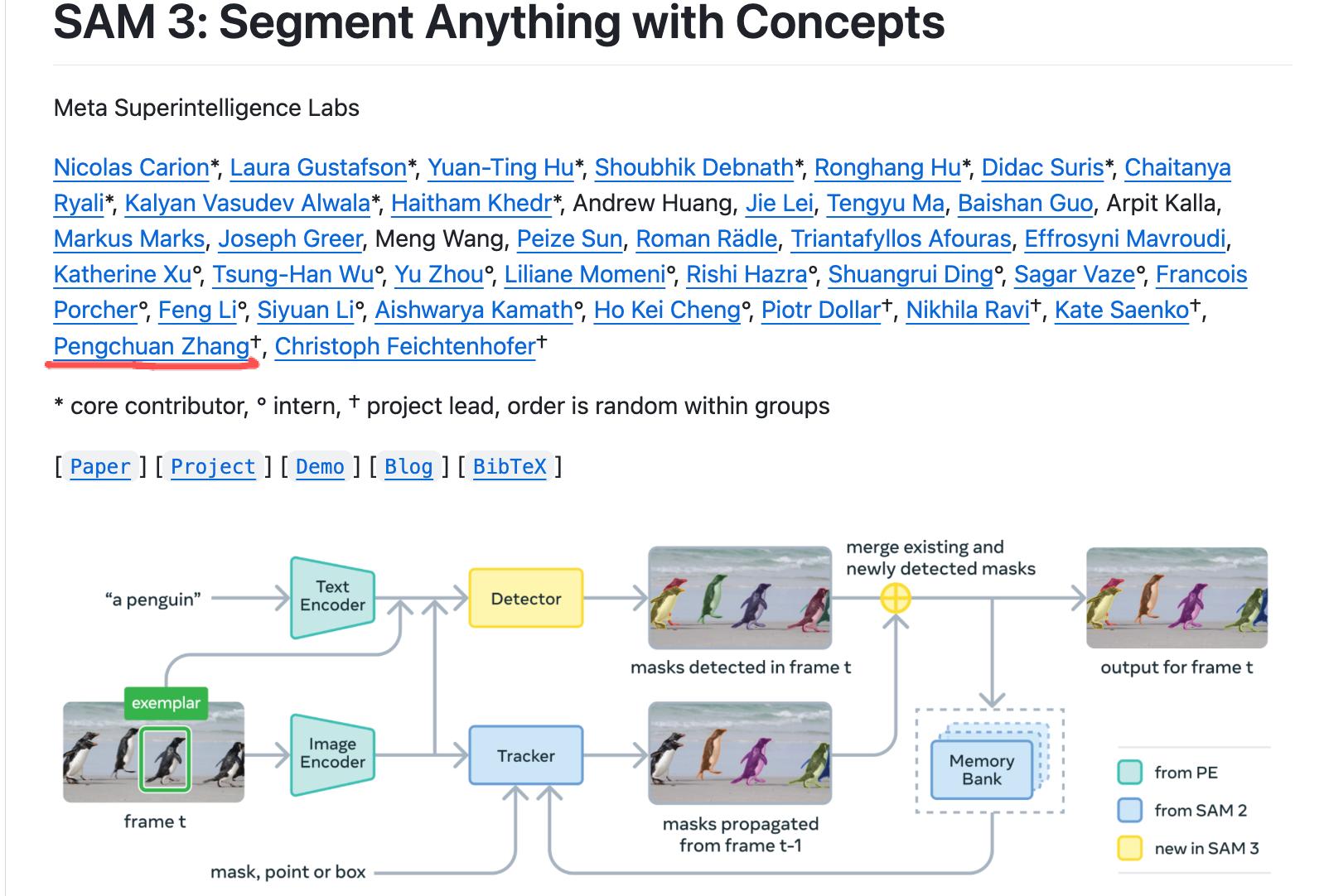 无独有偶,张鹏川在Meta所处的部门也是超级智能实验室。他曾在Meta参与并主导SAM 3图像分割模型和Llama开源系列模型视觉模块的开发工作。