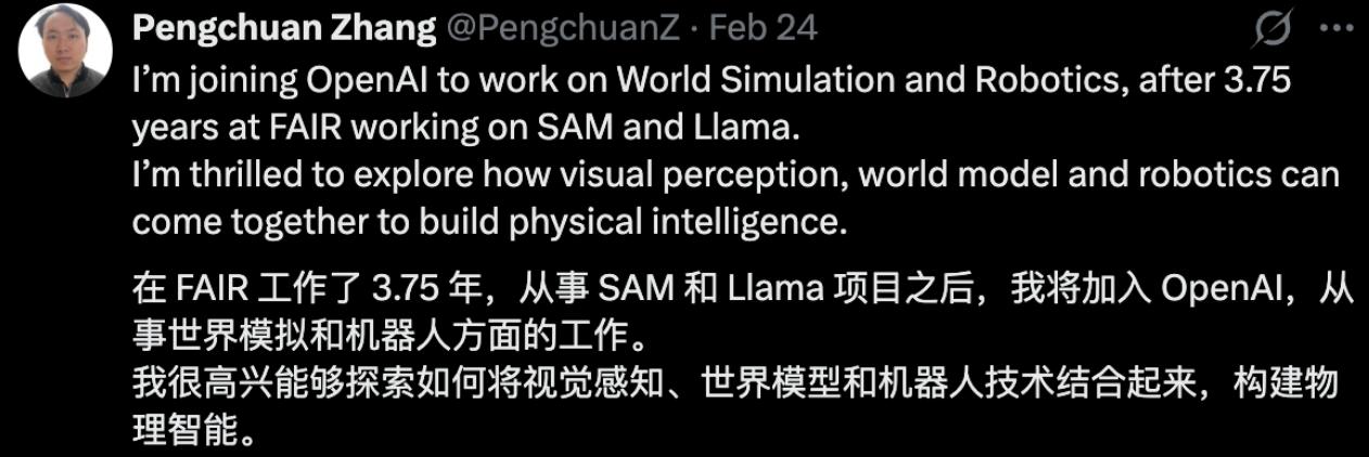 2月24日,Meta AI研究科学家、清华大学数学系学霸张鹏川(Pengchuan Zhang)在社交平台X官宣,离职Meta加入OpenAI,从事世界模型和机器人方面工作。