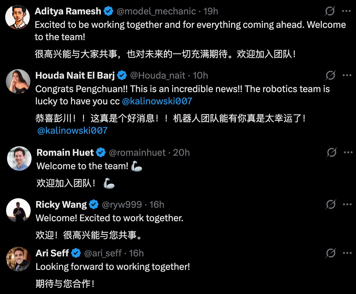 张鹏川发布加入OpenAI的推文下,OpenAI世界模型方向负责人之一、Sora团队负责人Aditya Ramesh,OpenAI开发者体验主管Romain Huet,OpenAI世界模型研究员Ricky Wang,OpenAI机器人专家Ari Seff纷纷评论欢迎加入。