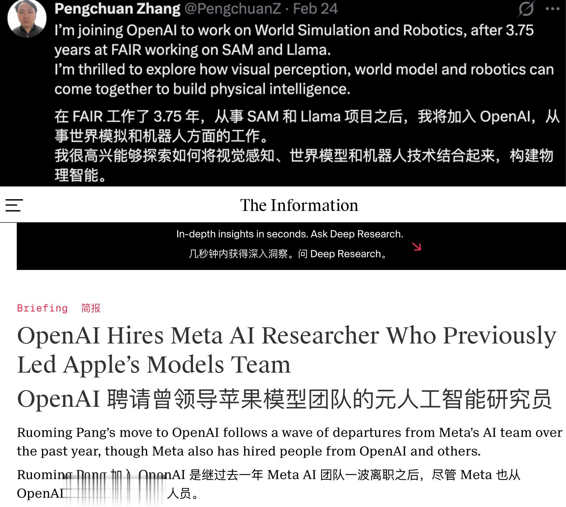 张鹏川宣布离开Meta的推文(上)、外媒爆料庞若鸣加入OpenAI的文章(下)