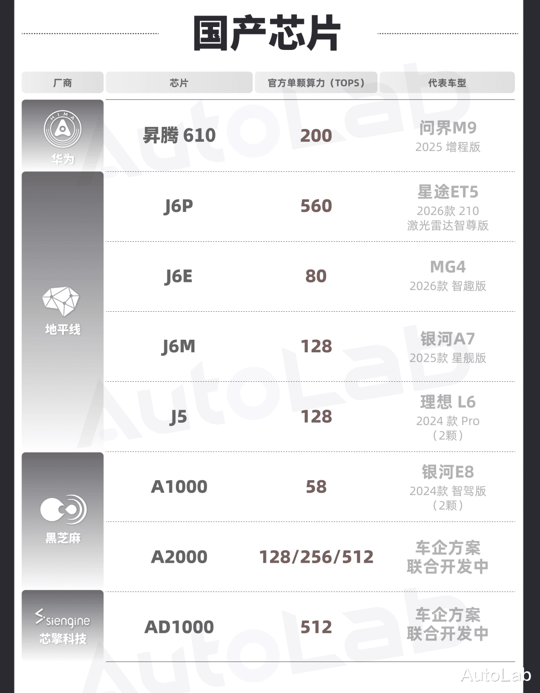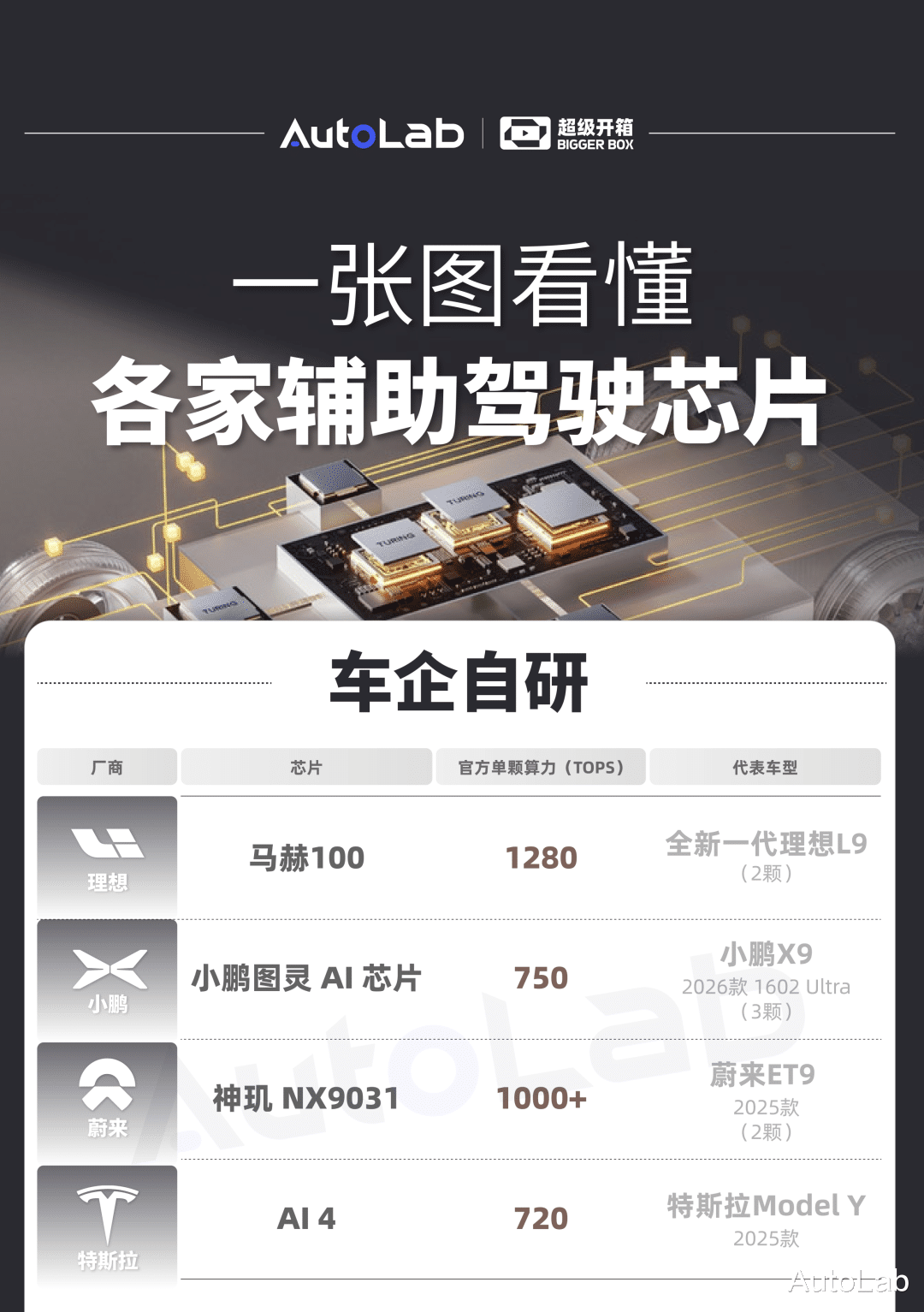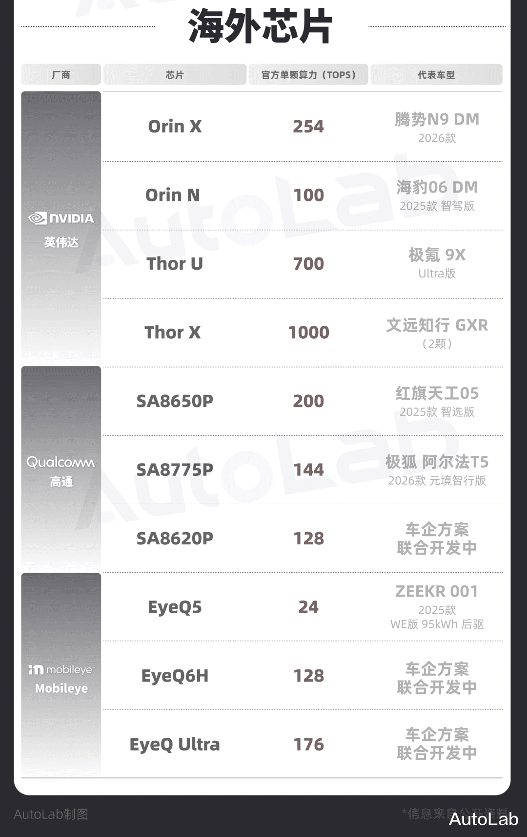 为了方便大家对市面上的芯片有更多的了解,我们整理了目前比较主流的芯片产品以及对应的算力和代表车型。